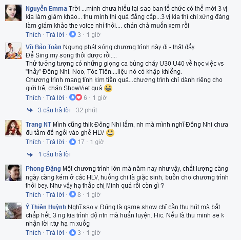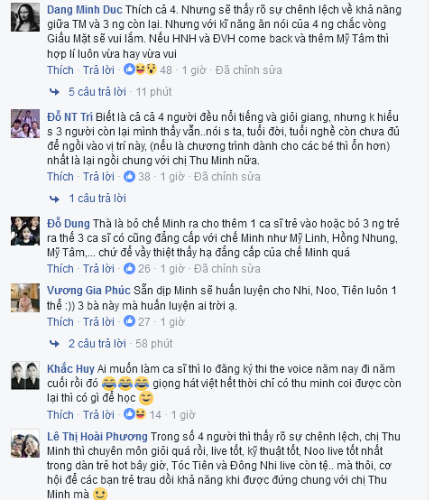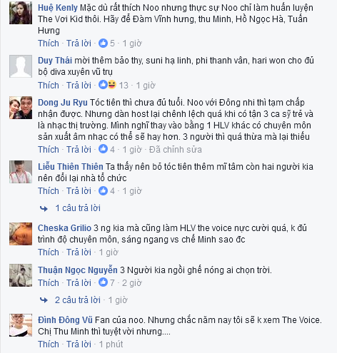 Một số bình luận của khán giả khi biết thông tin Thu Minh, Tóc Tiên, Đông Nhi và Noo Phước Thịnh ngồi ghế nóng chương trình Giọng hát Việt 2017.