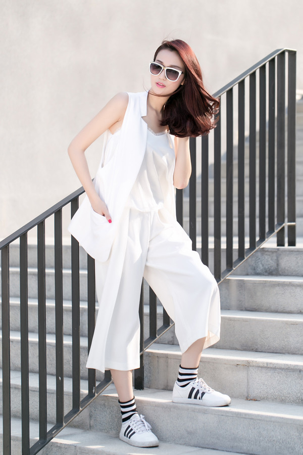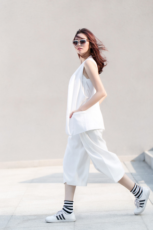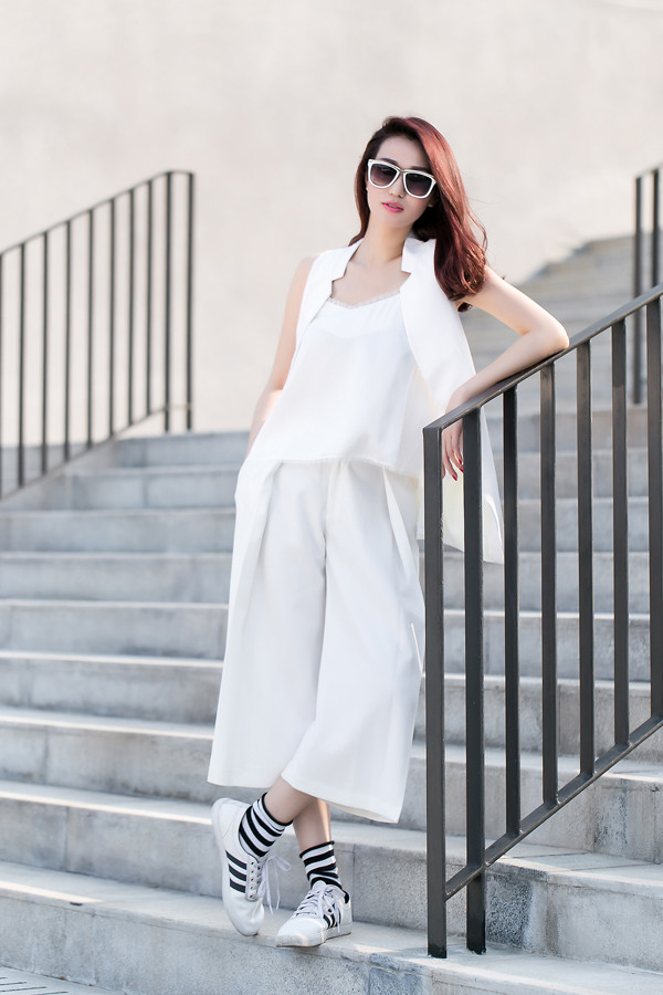 Những món đồ tưởng đối lập phong cách như áo hai dây, gile vest và giày thể thao lại trở nên đầy hòa hợp nhờ việc mix cùng quần ngố culottes.