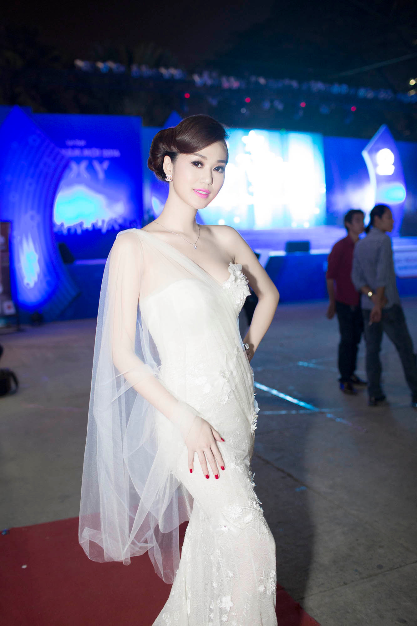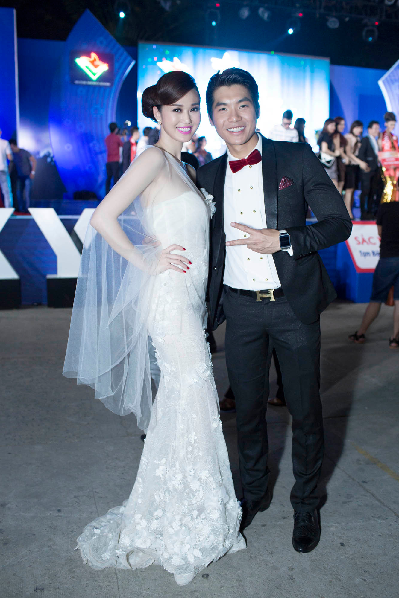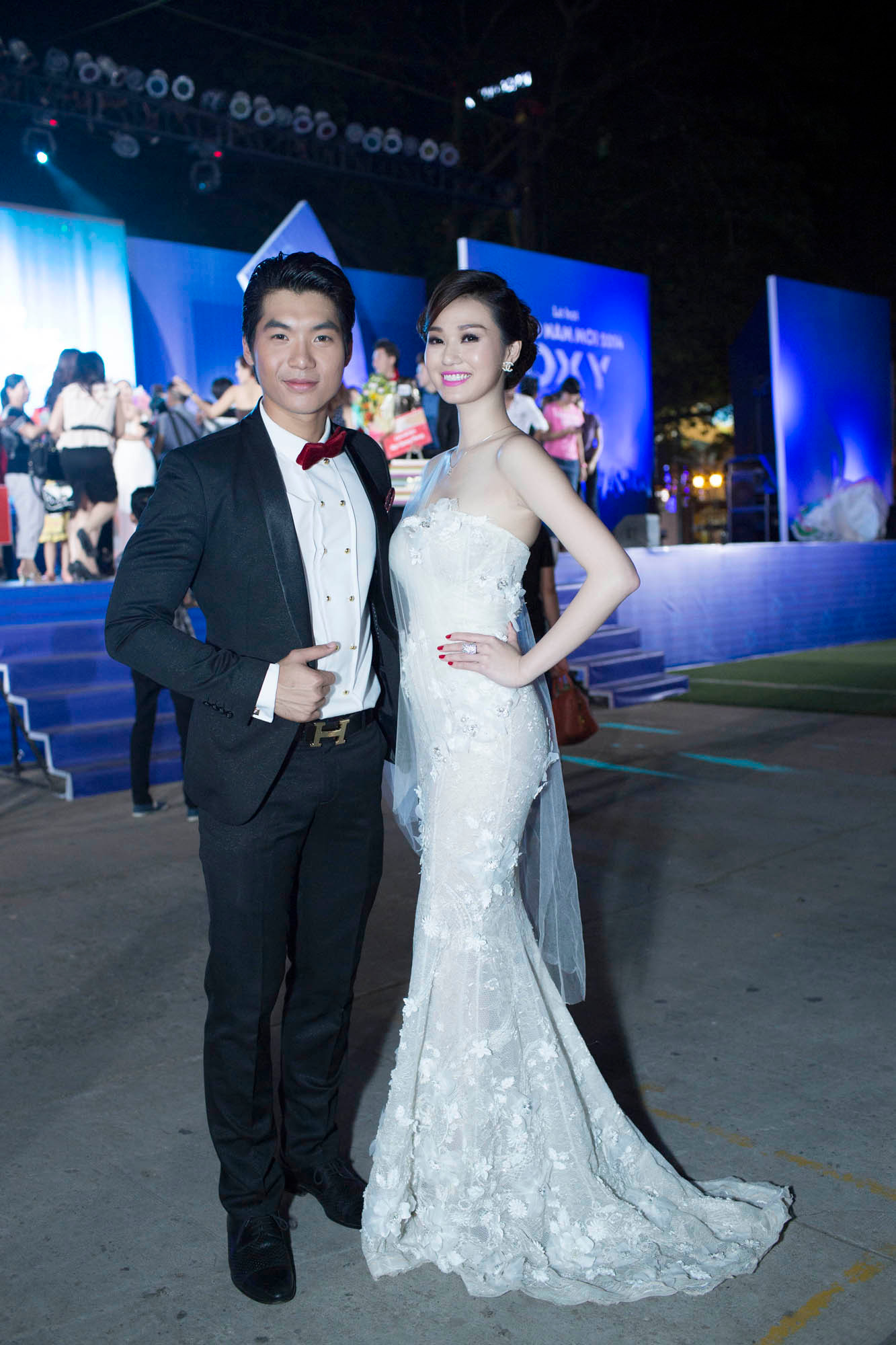 Tham dự đêm chung kết tối qua, Khánh My diện đầm dạ hội màu trắng muốt, mỏng manh của nhà thiết kế Hoàng Hải, còn Trương Nam Thành thì bảnh bao và lịch lãm trong bộ vest đen.