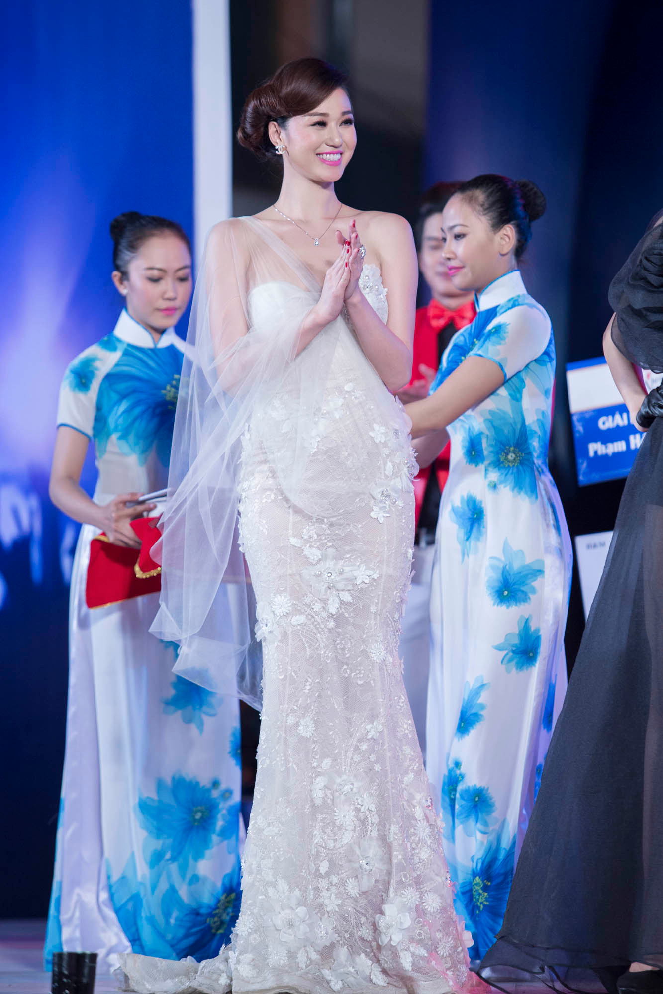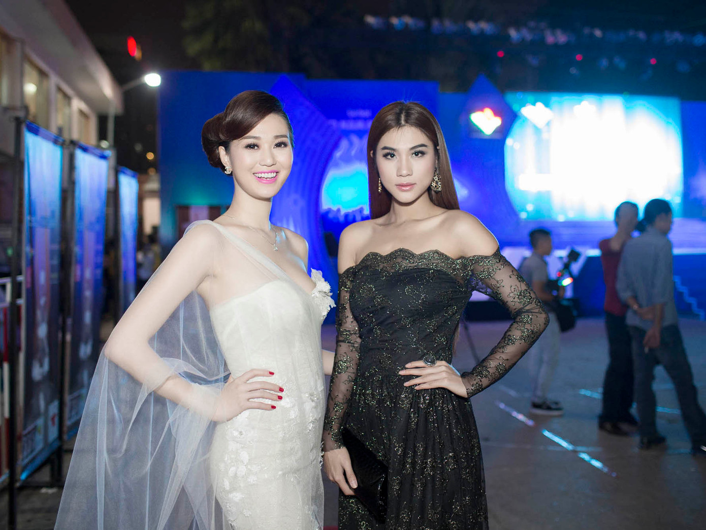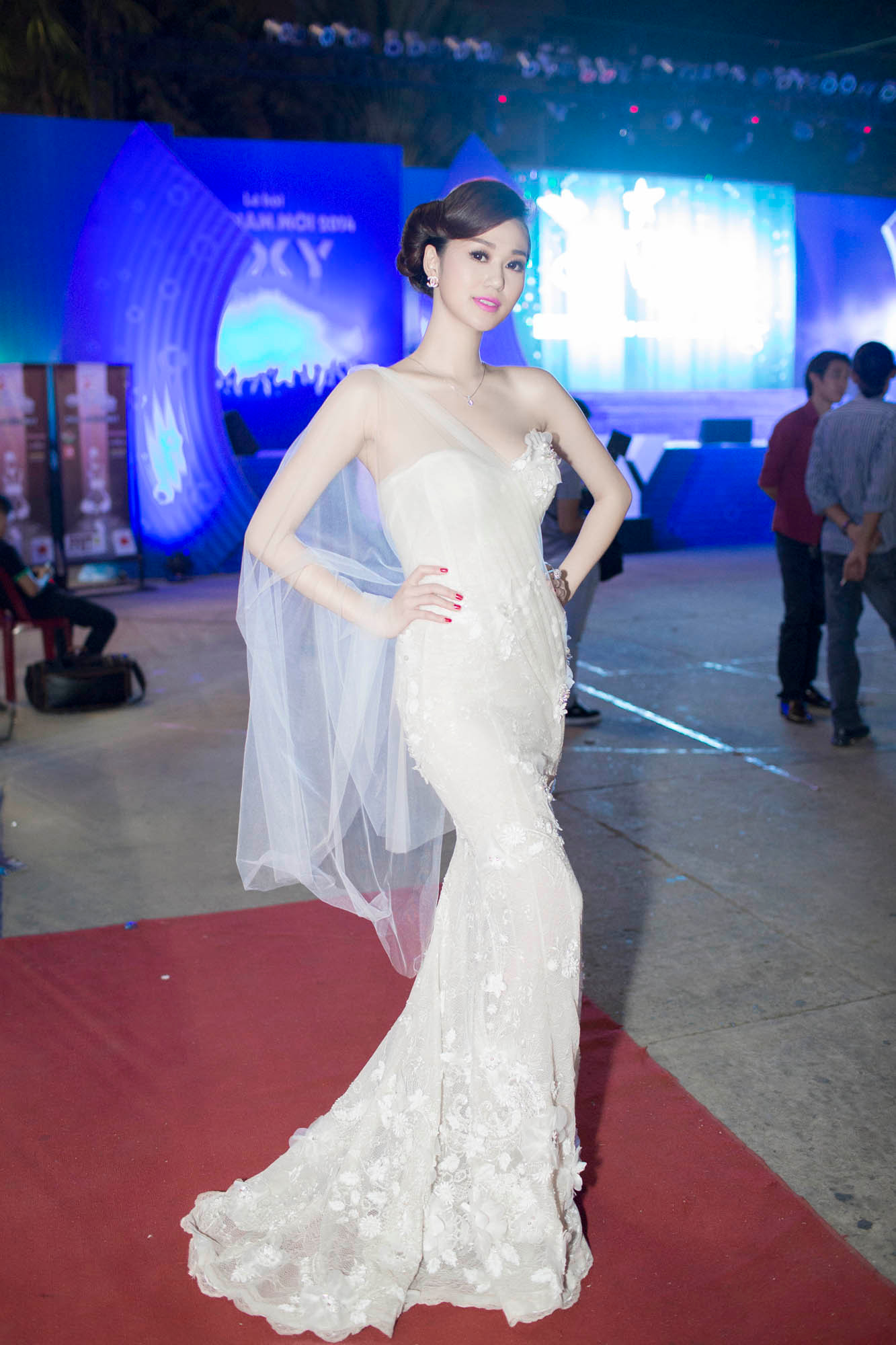 Tham dự đêm chung kết tối qua, Khánh My diện đầm dạ hội màu trắng muốt, mỏng manh của nhà thiết kế Hoàng Hải, còn Trương Nam Thành thì bảnh bao và lịch lãm trong bộ vest đen.