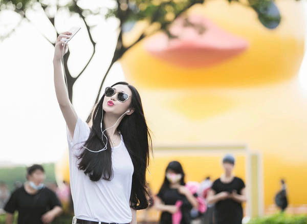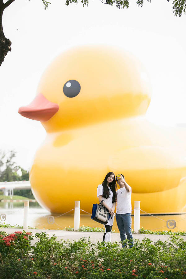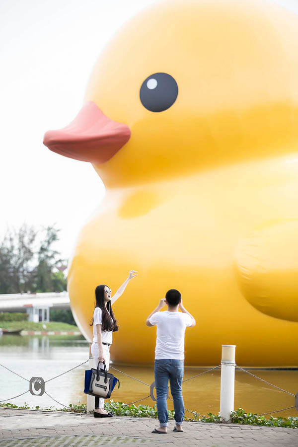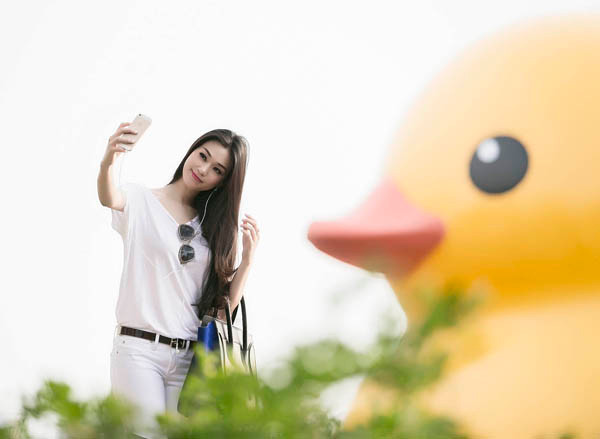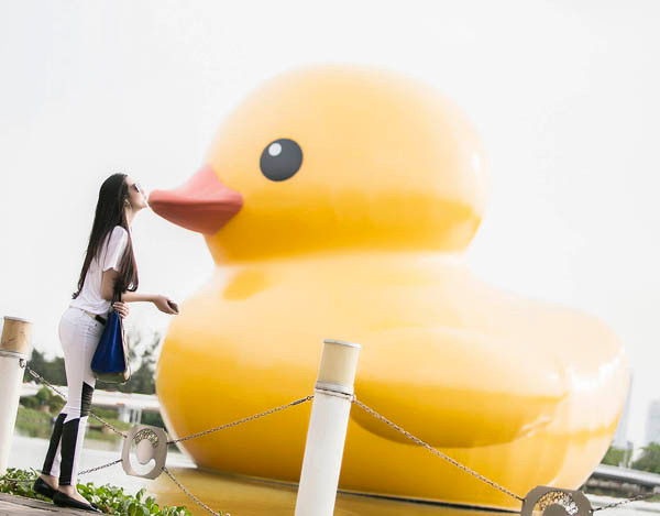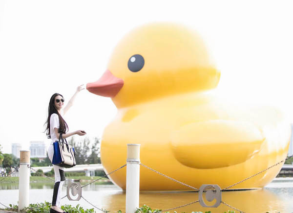 Nữ người mẫu hồn nhiên chụp ảnh tự sướng bên chú vịt vàng nổi tiếng.