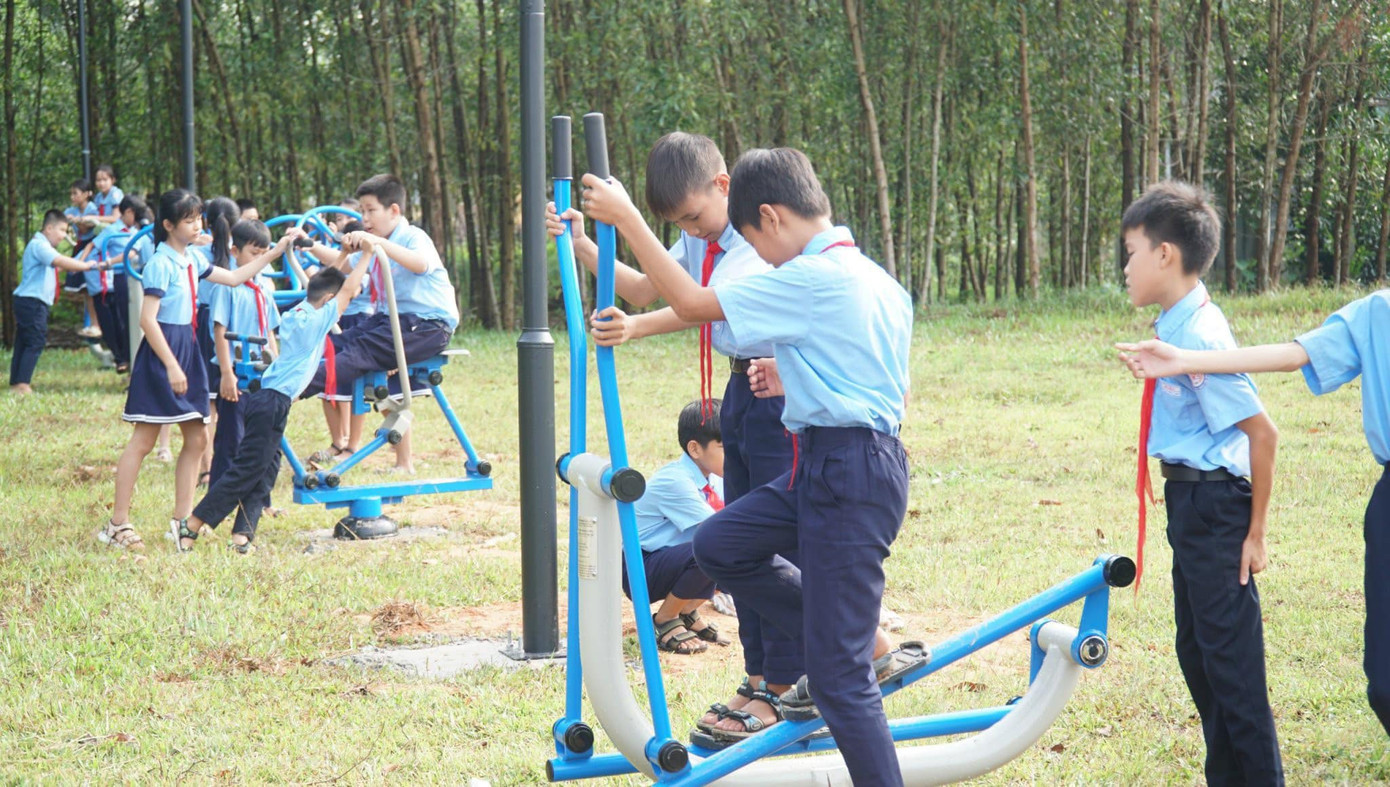 | Các em học sinh nông thôn hào hứng với sân chơi mới. |