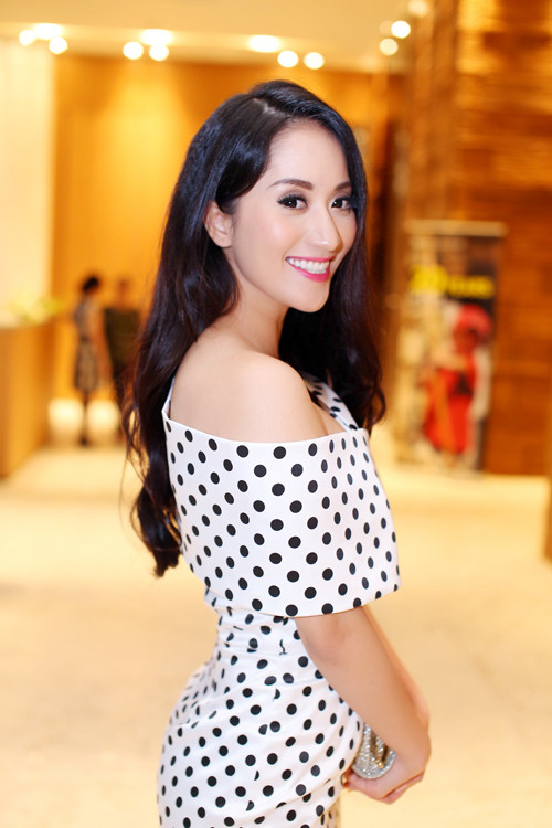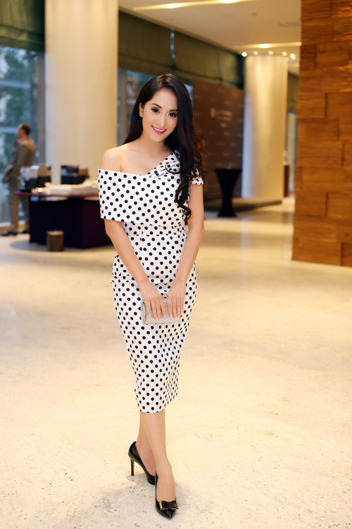 Xuất hiện trong buổi họp báo tại TP. HCM vào ngày hôm qua, Khánh Thi nổi bật trước ống kính khi diện bộ váy chấm bi lệch vai theo phong cách cổ điển khiến cô xinh đẹp như một tiểu thư đài các.