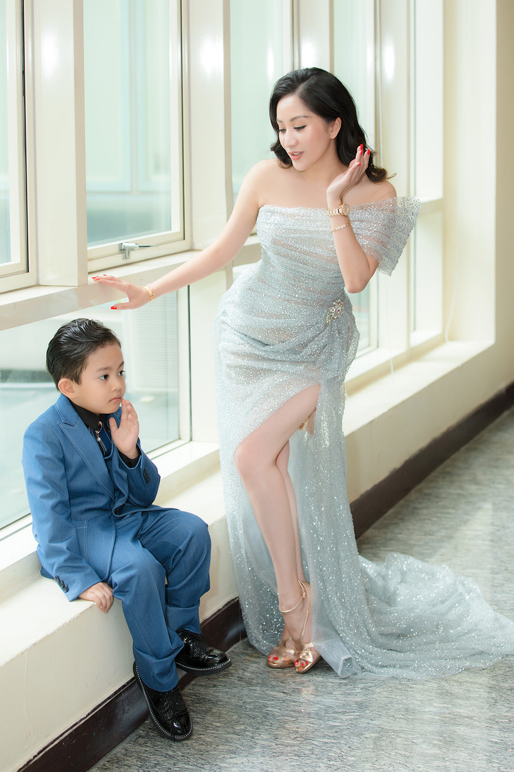 Bé Kubi còn rất đáng yêu khi giúp mẹ chỉnh váy để tạo dáng chụp ảnh trên thảm đỏ.