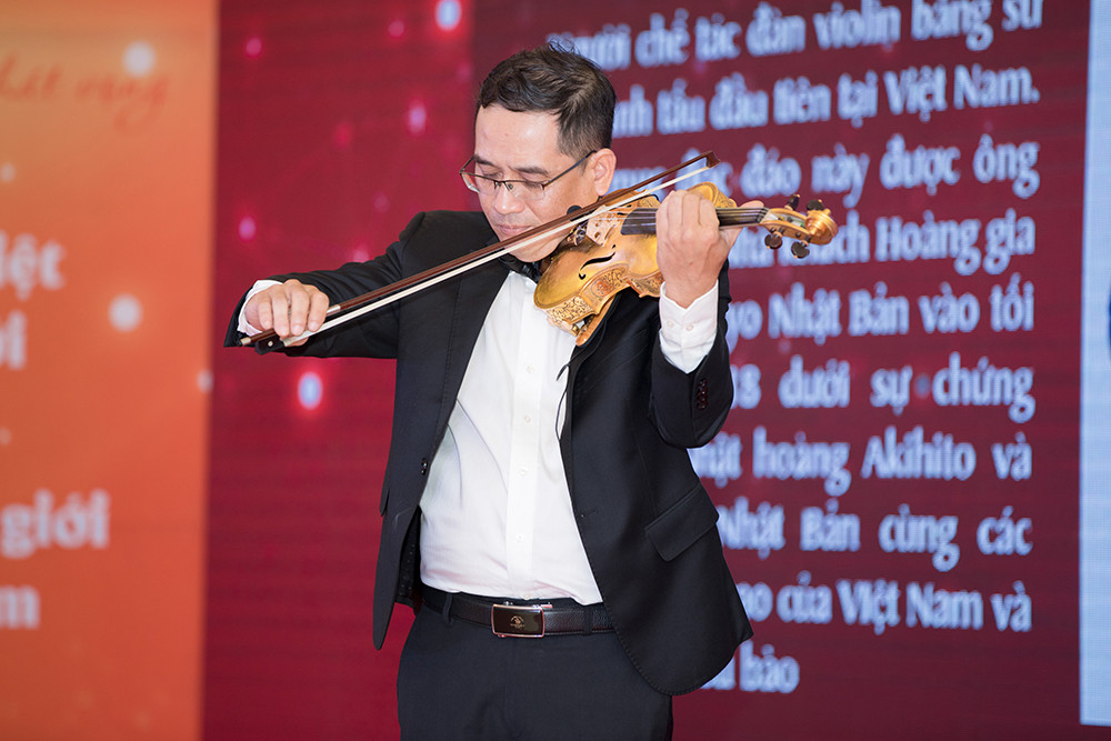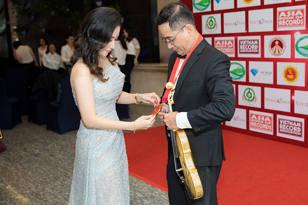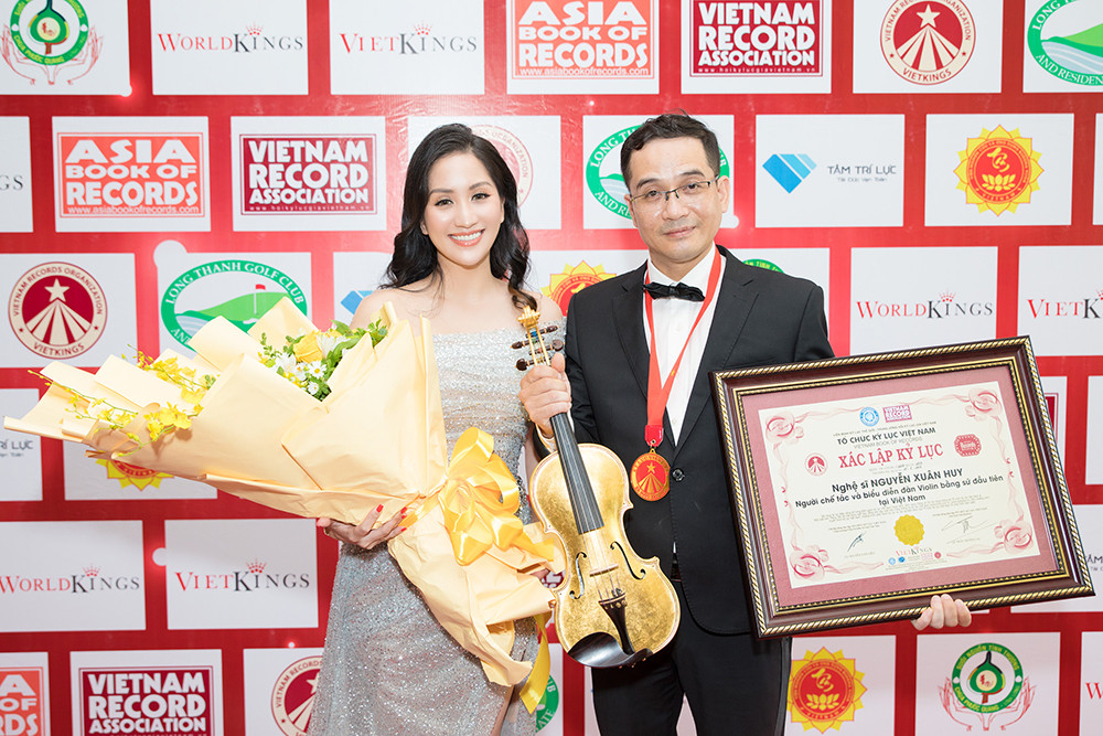 Trong sự kiện ‘Kỷ lục Việt Nam 15 năm – Một hành trình’ tại TP HCM hôm 9/9, nghệ nhân Nguyễn Xuân Huy, anh ruột của kiện tướng dance sport Khánh Thi - đã được trao bằng xác lập kỷ lục ‘Người chế tác và biểu diễn đàn violin bằng sứ đầu tiên tại Việt Nam’.