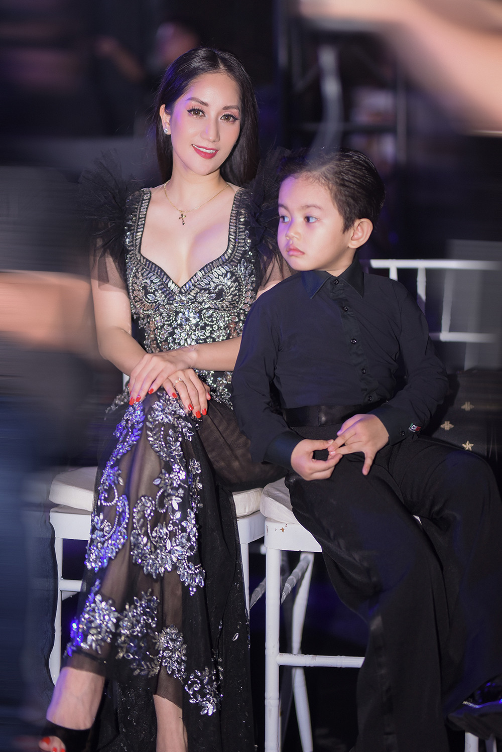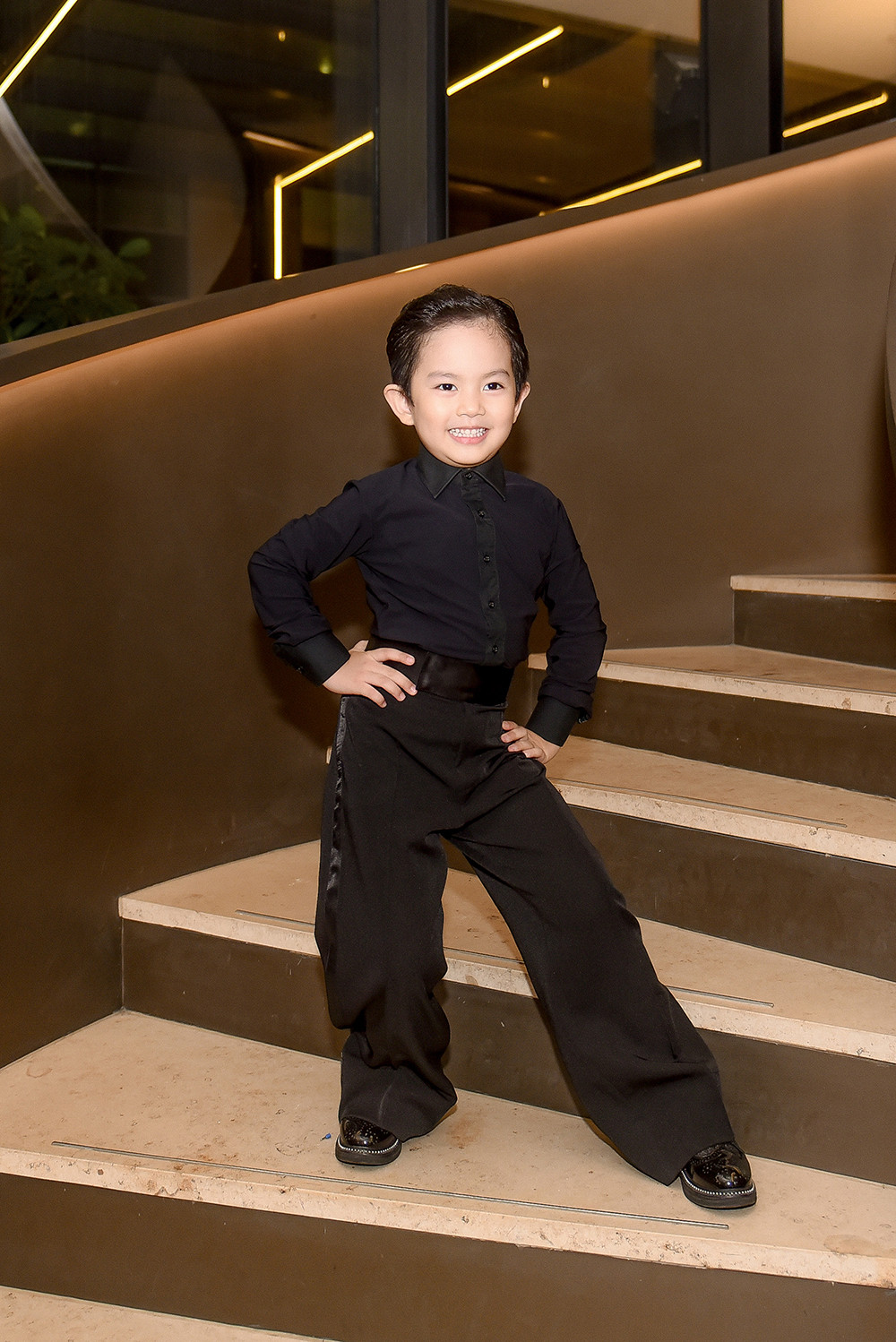 Nữ kiện tướng dance sport diện bộ đầm đuôi cá màu đen quyến rũ, trong khi đó con trai cô - bé Kubi mặc nguyên cây đen, tóc vuốt keo chỉn chu.