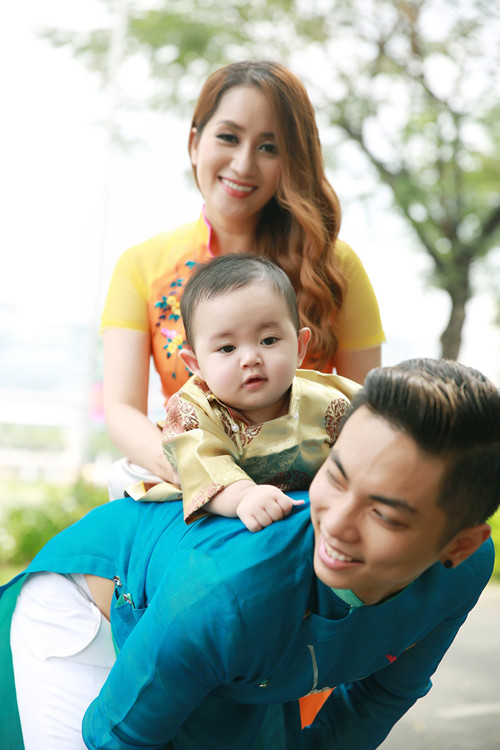 Vợ chồng kiện tướng dancesport diện áo dài cách điệu của nhà thiết kế Thuận Việt. Bé Kubi cũng được chuẩn bị một bộ áo dài riêng để chụp ảnh cùng bố mẹ.