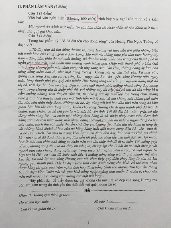 Ở câu 2 của phần Đọc hiểu, từ “sông Hương” được viết trong đề thi là“sống Hương”. Tương tự, trong đoạn văn trích dẫn tác phẩm “Ai đã đặt tên cho dòng sông” của Hoàng Phủ Ngọc Tường, còn có thêm 1 lỗi chính tả hi hữu khác.