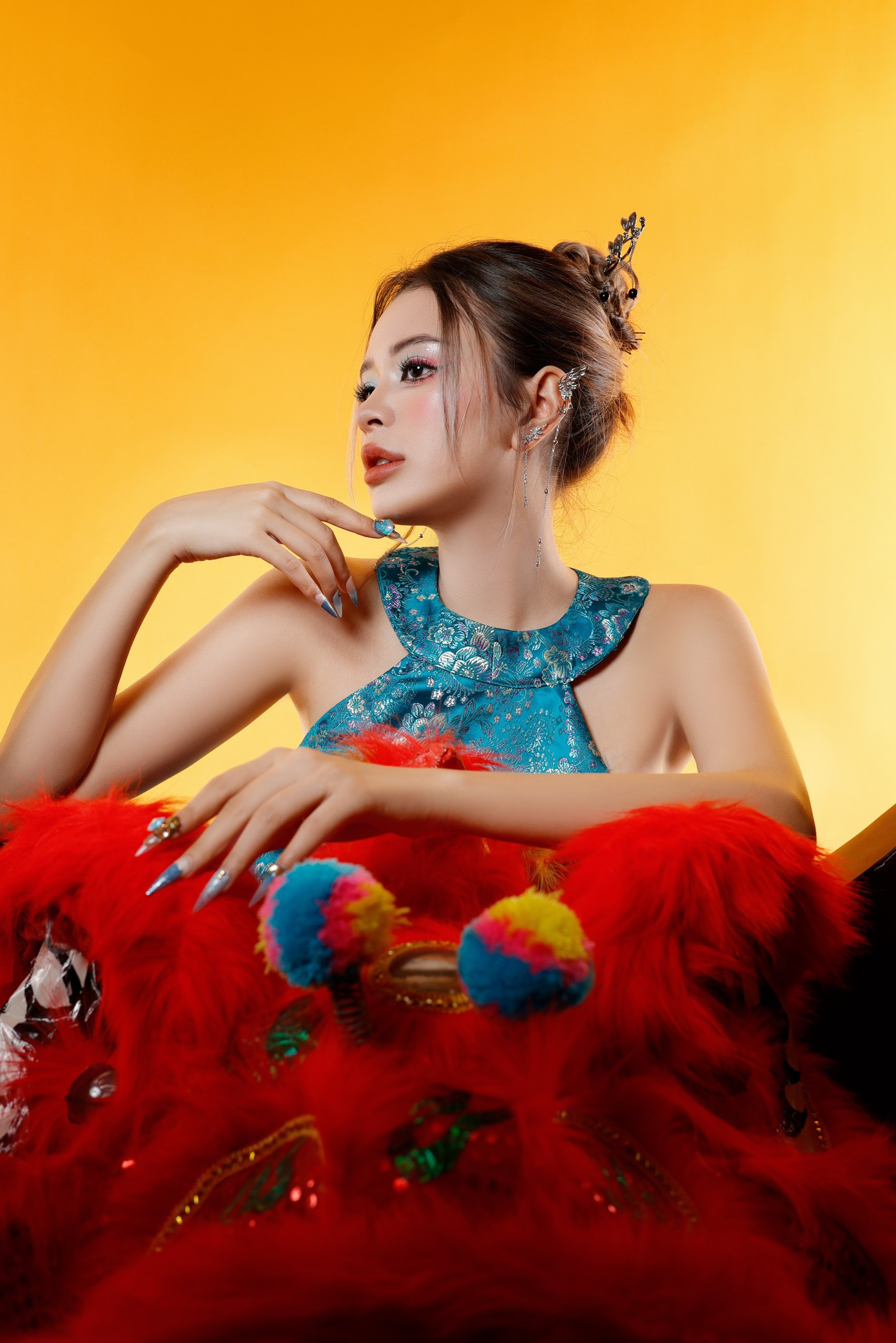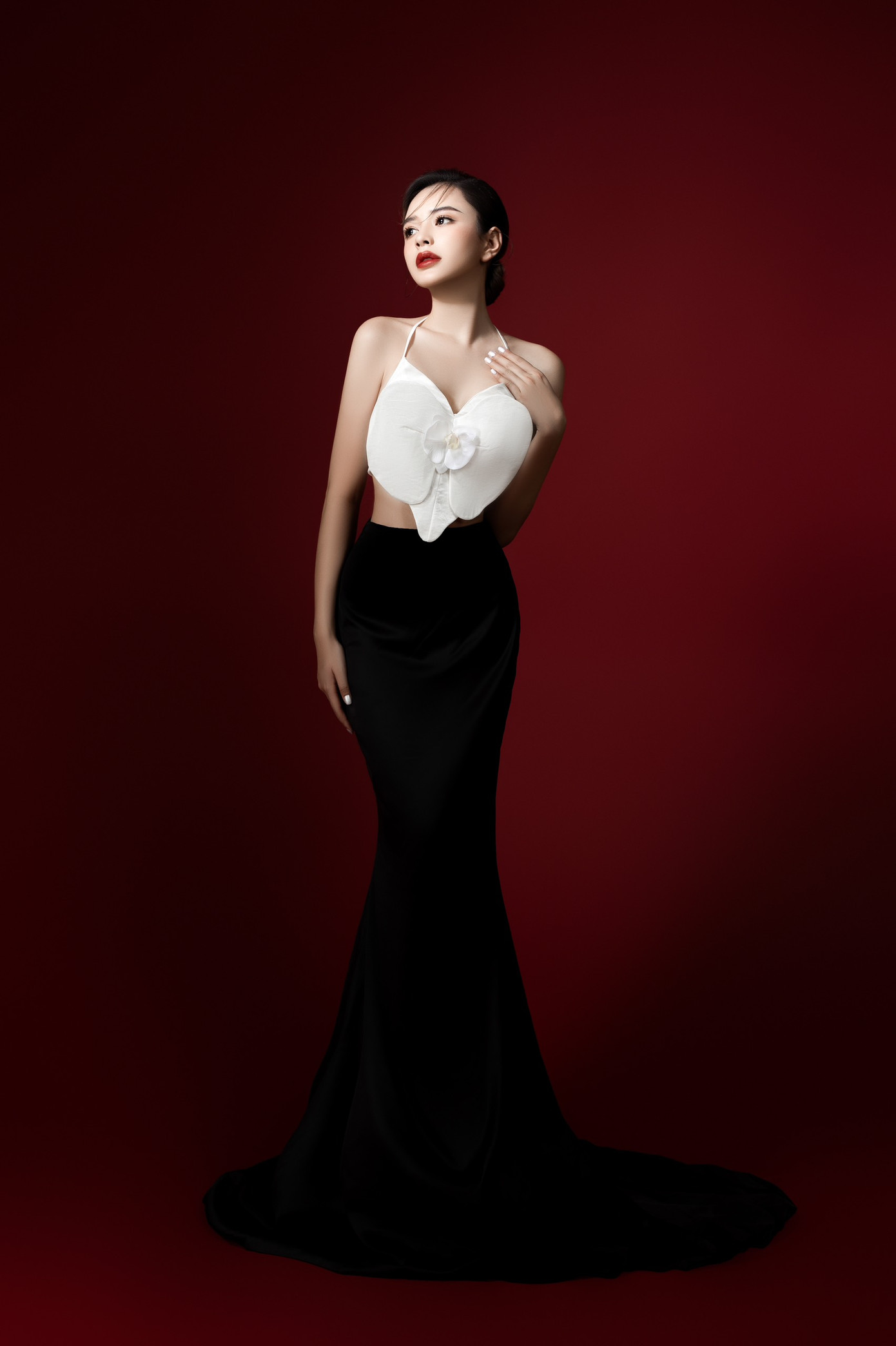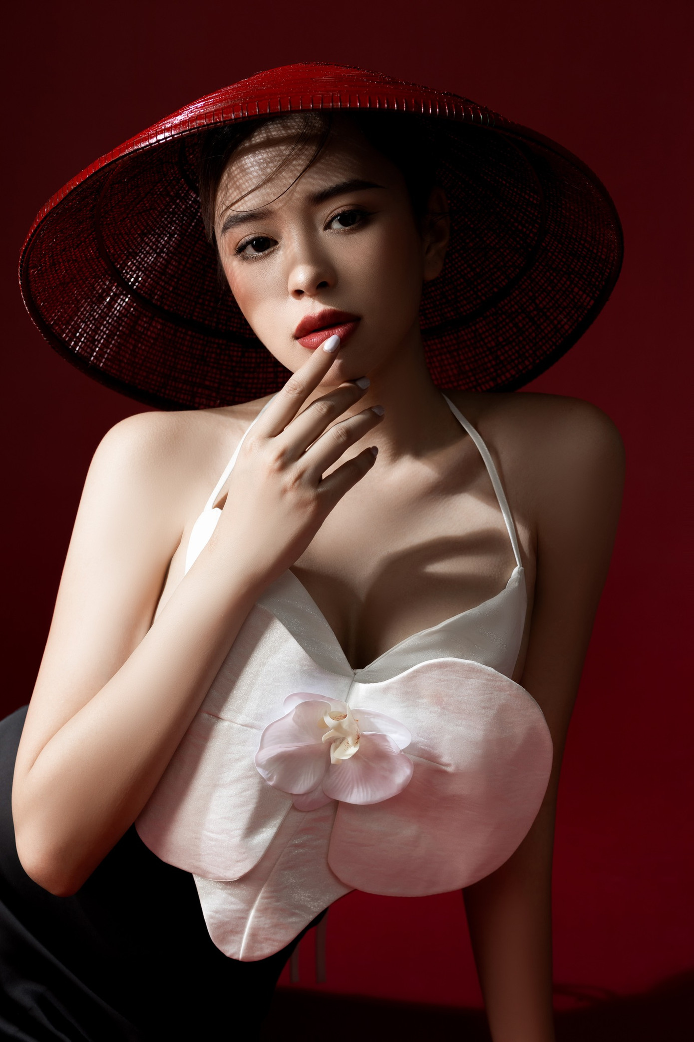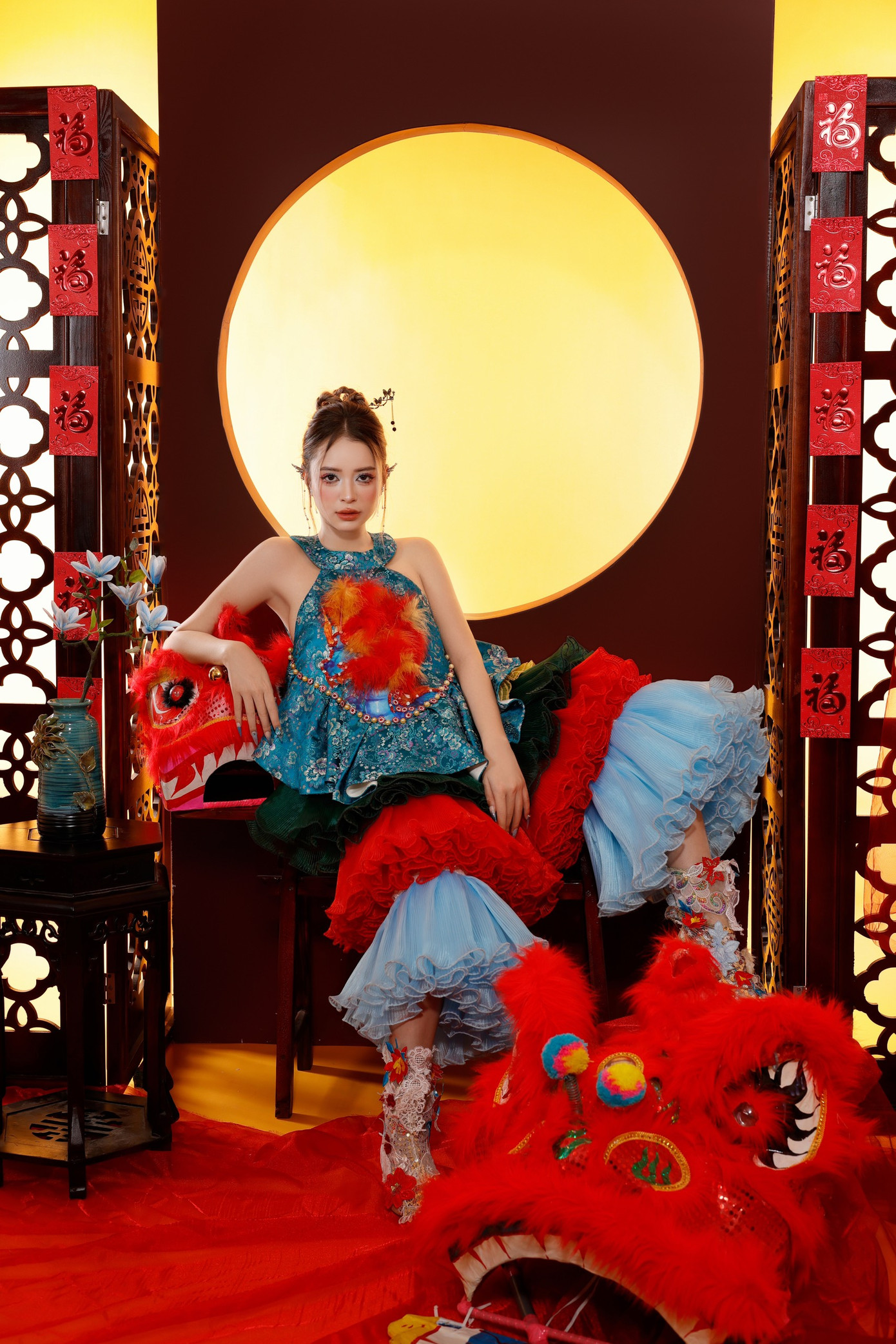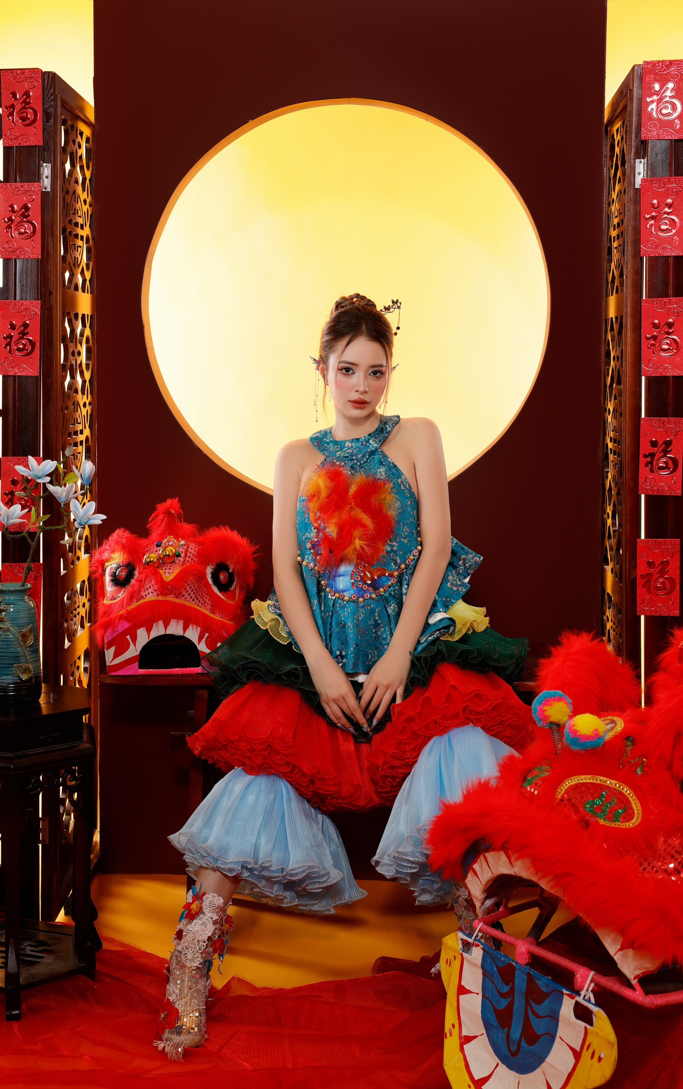 Khánh Uyên cho hay: “Hình ảnh của hoa lan trắng và Lân sư rồng gần như tương phản về mặt hình ảnh của mình. Một bên sẽ chững chạc hơn, 1 bên sẽ vui nhộn không khí Tết hơn. Tuy nhiên nó đều có 1 điểm chung là sắc đỏ, mình chọn chụp vì với mình năm nay sẽ là năm tuổi và sắc đỏ sẽ mang lại nhiều may mắn cho bản thân. Bộ ảnh cũng bày tỏ sự biết ơn một năm đã qua, hy vọng về một năm mới tới may mắn và tràn đầy niềm vui.”