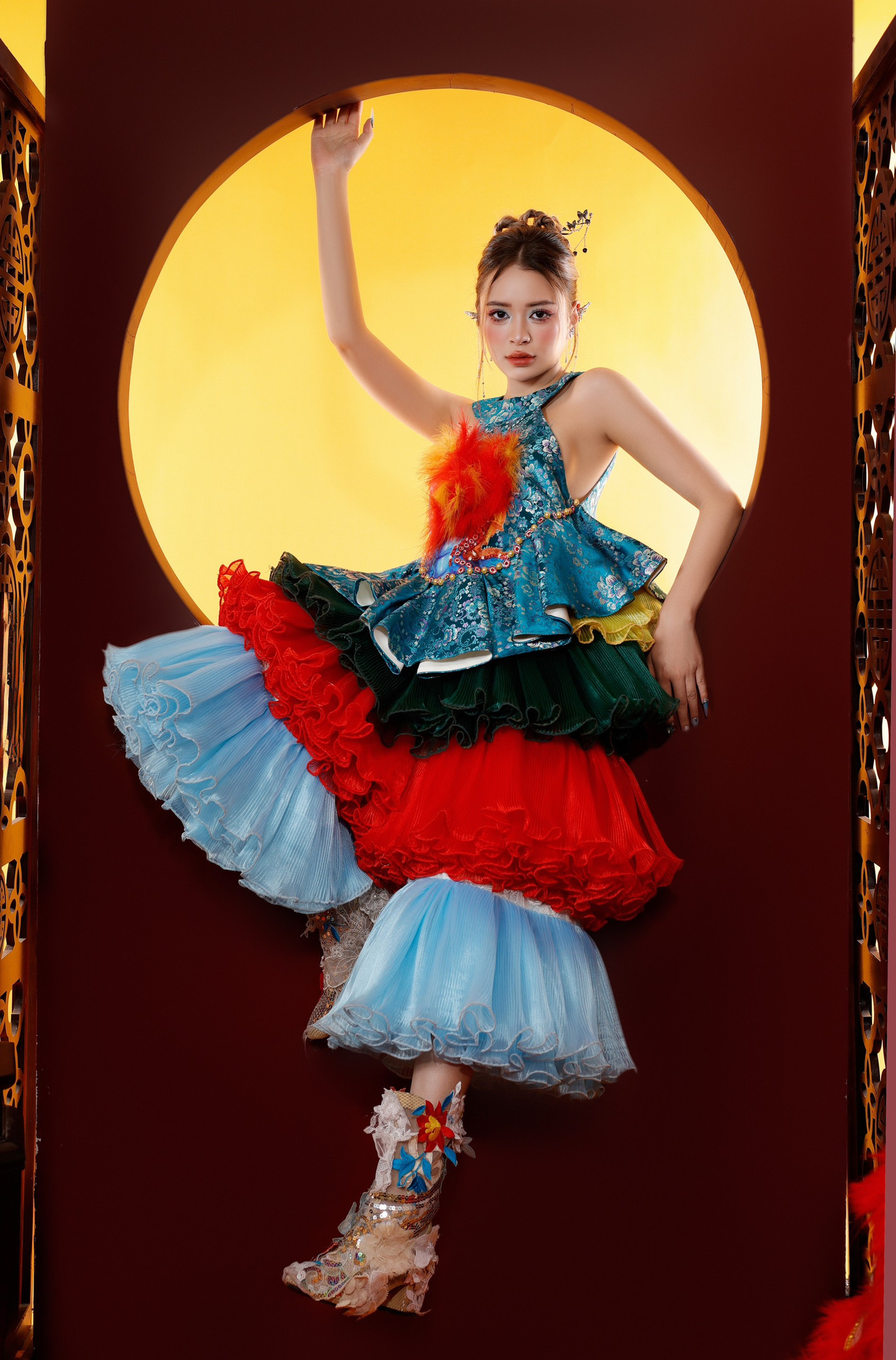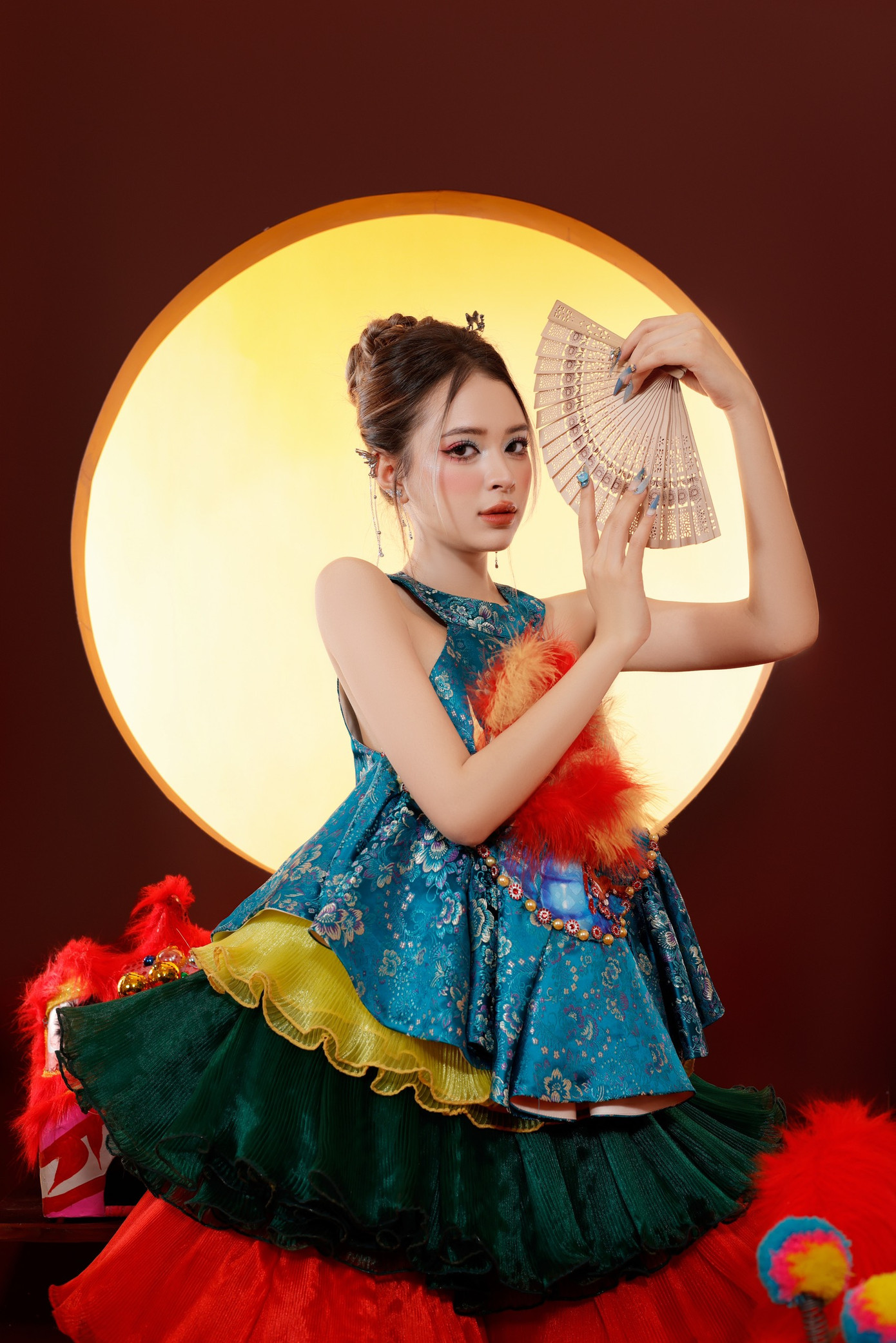 Nếu hoa lan trắng cho thấy một nét đẹp dịu dàng tinh khôi thì đến với hình ảnh trong trang phục múa Lân lại cho thấy một thần thái khác của Tôn Nữ Khánh Uyên.
