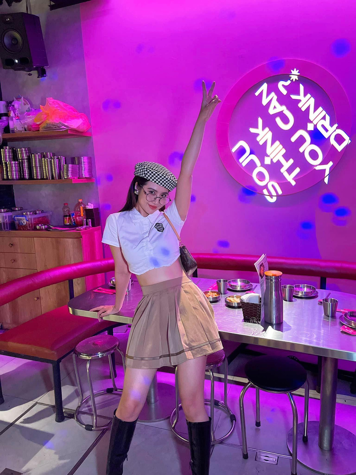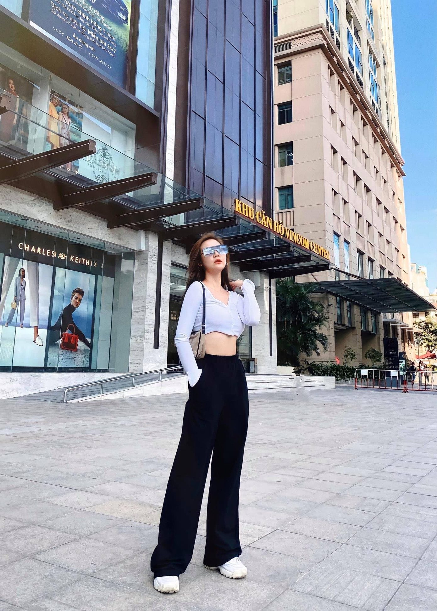 Trên phim Thương Ngày Nắng Về ăn mặc kín đáo bao nhiêu thì ngoài đời, Huyền Lizzie lại phóng khoáng hơn. Cô rất thích diện áo crop top để khoe khéo vòng eo săn chắc.