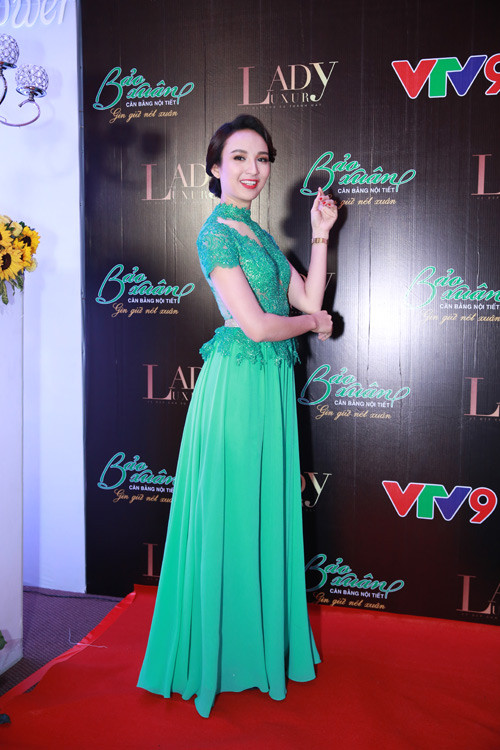 Hoa hậu Ngọc Diễm chọn đầm xanh nhẹ nhàng.