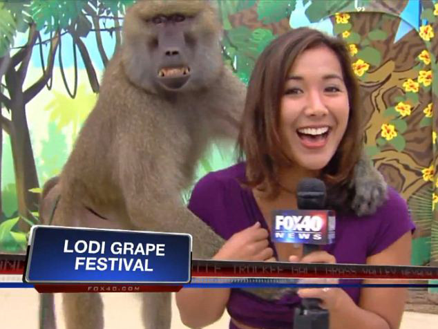 TPO – Một con khỉ đầu chó đã sờ ngực nữ phóng viên Sabrina Rodriguez (29 tuổi) dẫn chương trình Fox 40 ở Sacramento, California, Mỹ ngày 12/9 trước ống kính máy quay rồi cười toe toét.