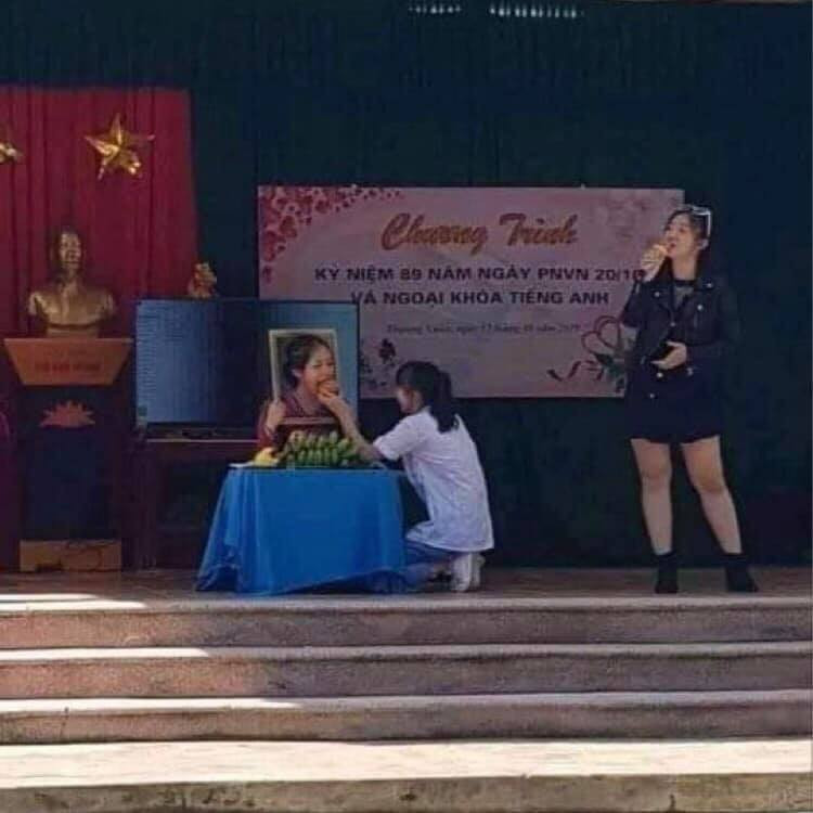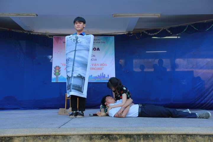 Mới đây, hội teen lại thích thú truyền tay nhau hình ảnh một buổi ngoại khóa về văn hóa giao thông tại THPT Hoàng Văn Thụ (Nha Trang, Khánh Hòa). Cụ thể, các bạn học sinh đóng lại một hoạt cảnh minh họa cho chủ đề của buổi ngoại khóa. Trong khi hai diễn viên chính đang thể hiện phân cảnh đau khổ, vật vã dưới nền đất, một nhân vật khác - cây cột điện - đứng đó, vô cùng tròn vai mà không kém phần hài hước.