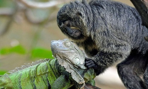 Con khỉ cái mặt trắng thuộc loài khỉ đuôi sóc dành cho thằn lằn xanh những cử chỉ âu yếm và thậm chí còn cắn đùa nó. Ảnh: Caters News Agency.