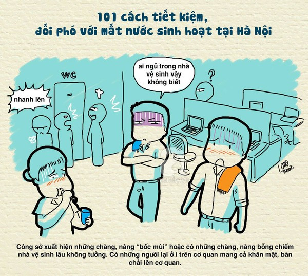 Khi ở nhà mất nước sạch, với những ai làm văn phòng còn cảm thấy may mắn vì ít ra có chốn để vệ sinh cá nhân, trú tạm trong khi chờ nước sạch về. Ghi nhận tại nhiều khu văn phòng Hà Nội, tình trạng nhân viên mang các vật dụng cá nhân như quần áo, bàn chải đánh răng, khăn mặt, thậm chí cả chăn chiếu những đợt Hà Nội mất nước sạch gia tăng đột biến. Điều buồn cười là nhiều chàng, nàng còn mang cả những thói quen ở nhà như... chiếm giữ nhà vệ sinh không thời hạn.