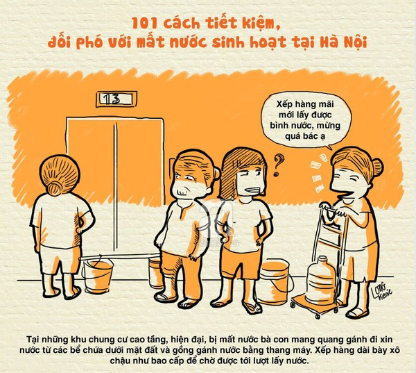 Những ngày mất nước sạch, tại các tòa chung cư hiện đại, thường ngày im ắng, chả ai hỏi han nhau, vào thang máy cũng chẳng có tiếng động. Ấy vậy mà đợt mất nước sạch, cả khu rộn ràng tiếng chân người mang xô chậu đi xách nước. Mọi người bàn tán xôn xao, hỏi han nhau chỗ mua xô chậu, chỗ mua nước rẻ, giúp đỡ nhau mang nước lên tầng, chia sẻ nước sạch cùng nhau...