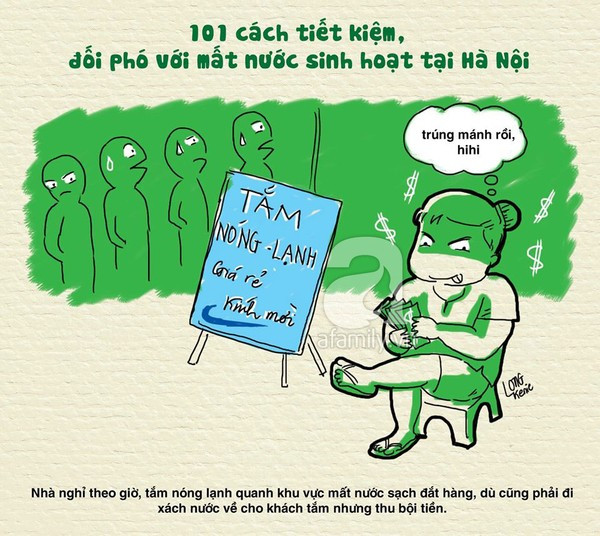 Bị mất nước sinh hoạt triền miên, nhiều gia đình ngoài việc sơ tán tới nhà họ hàng, người quen, nhiều lần cũng ngại, nên đã phải chi những khoản tiền không nhỏ để sử dụng dịch vụ bên ngoài như thuê nhà nghỉ, tắm nóng lạnh. Thậm chí còn mang cả nước khoáng ra để... gội đầu với giá "cắt cổ" 53.000 đồng 1 bình 19 lít nước.