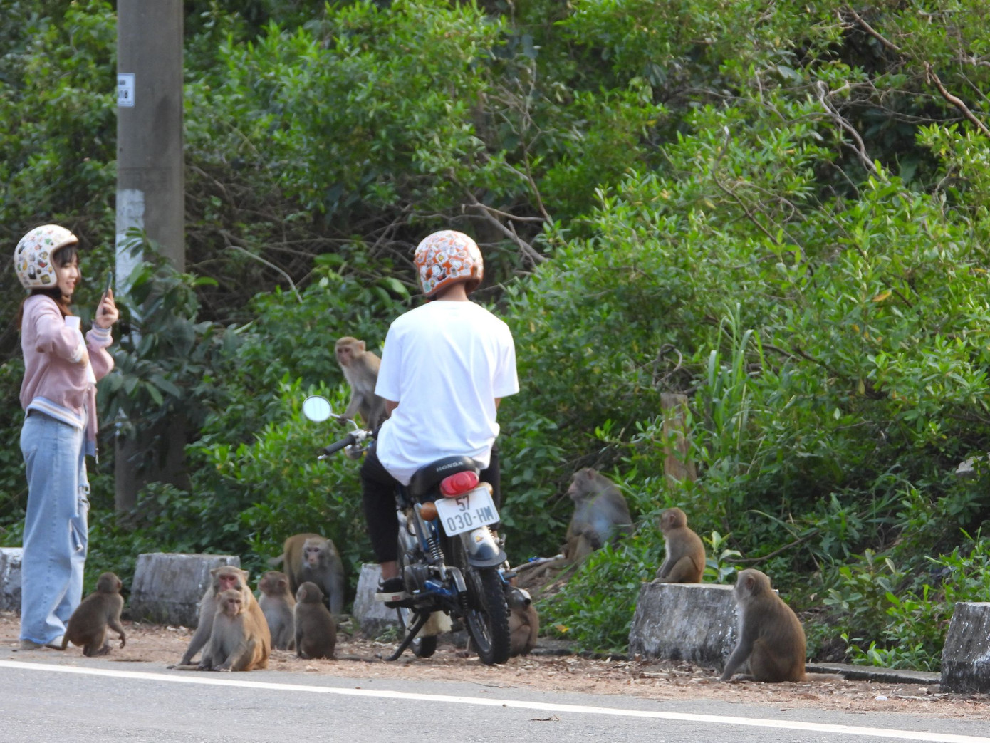 Du khách vô tư quay phim bầy khỉ dạn dĩ ngồi bên đường.