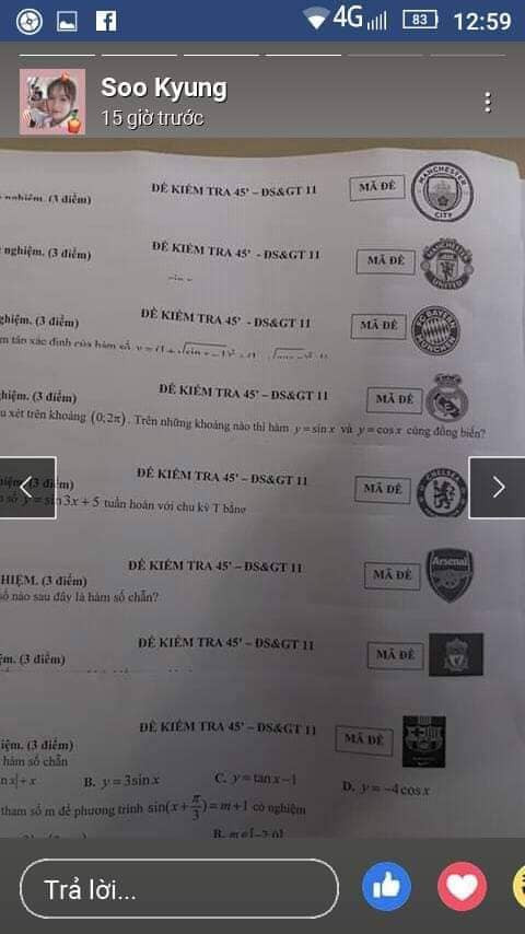 Ngoài “cô giáo K- pop”, còn có rất nhiều thầy cô cũng dễ thương không kém khi sáng tạo những mã đề kiểm tra. Ví dụ khi thầy giáo là một fan bóng đá chính hiệu thì mã đề sẽ được thay thế bằng logo của các CLB nổi tiếng thế này luôn! Chưa kể nhiều thầy cô còn hạn chế tình trạng hỏi bài, đọ đáp án theo cách "siêu lầy" khi đánh mã đề kiểu "Giống đề mày", "Đề tao không có mã",... "Hỏi mã đề nhau mà gặp được câu trả lời kiểu này thì chỉ còn biết cách câm nín, tự mình giúp mình thôi chứ sao. Thầy cô quả là cao tay!" - FB L.P hài hước bình luận.