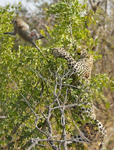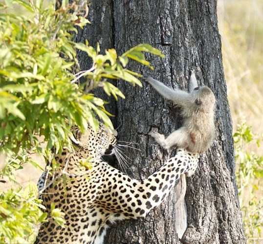 Vào một buổi trưa đầy nắng, con khỉ vervet đang dạo chơi thì bất ngờ gặp phải sự truy đuổi dữ dội của báo đốm đói mồi. Nhận thấy nguy hiểm cận kề, khỉ vervet nhanh chóng leo lên cây để tránh nạn. (Nguồn Dailymail)
