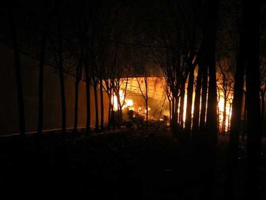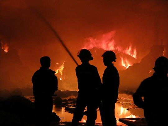 Đến rạng sáng 4/3, lửa vẫn cháy tại kho hàng của tại Công ty Ninh Sơn (chuyên kinh doanh bông vải, đóng tại phường Hòa Lợi, thị xã Bến Cát, tỉnh Bình Dương).