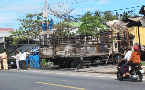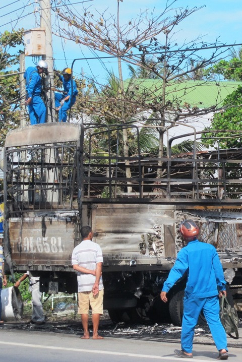 Đáng nói hơn, lửa lan rộng làm cháy một xe tải mang BS 69M1- 02325 đang đậu, phá hủy hoàn toàn đường dây cáp quang treo theo cột điện đi ngang qua kho hàng.