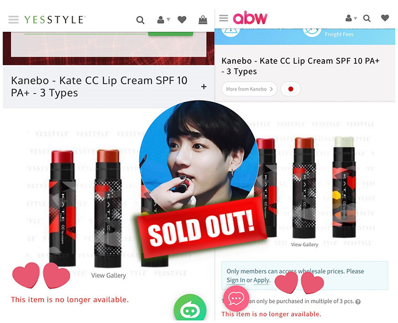 Đây cũng không phải lần đầu Jung Kook tạo ra hiệu ứng này, chỉ mới hôm trước thôi, thỏi son môi KATE CC LIP Cream được dùng để thoa lên môi Jung Kook trong Bangtan Bomb cũng đã ngay lập tức "cháy hàng" trên các trang web bán mỹ phẩm.