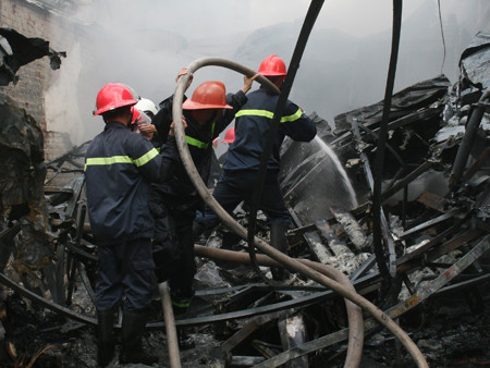 Do lối vào kho sơn rất nhỏ nên lực lượng cảnh sát PCCC phải rất khó khăn để tiếp cận, phun nước dập lửa từ hai bên và phía sau. Đường tiếp nước được bắc thẳng ra sông Nhuệ, cách đó gần 100m.