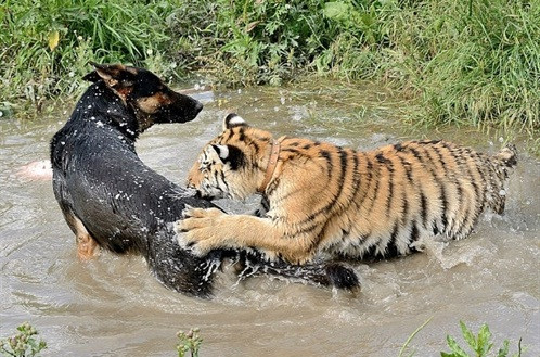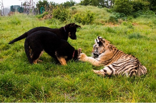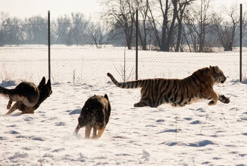 Hình ảnh hai chú chó nhà đang đuổi một con hổ lớn thực sự là một hình ảnh đẹp trong cuộc sống hàng ngày của hai loài động vật này tại một khu bảo tồn nhỏ.