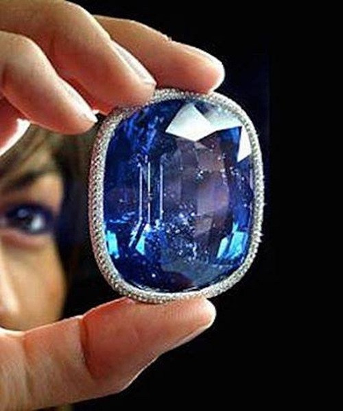 "Người khổng lồ Xanh của Phương Đông" là viên đá sapphire màu xanh dương nhiều mặt nhất thế giới, nặng 486,52 carat. Nó được gắn trên một chiếc trâm cài đầu bạch kim, bao quanh bởi những viên kim cương. Viên đá quý này có nguồn gốc từ Sri Lanka. Năm 2004, tại phiên đấu giá ở Geneva, Thụy Sĩ, một người Anh giấu tên mua nó với giá 1 triệu USD. Ảnh: GemSociety.