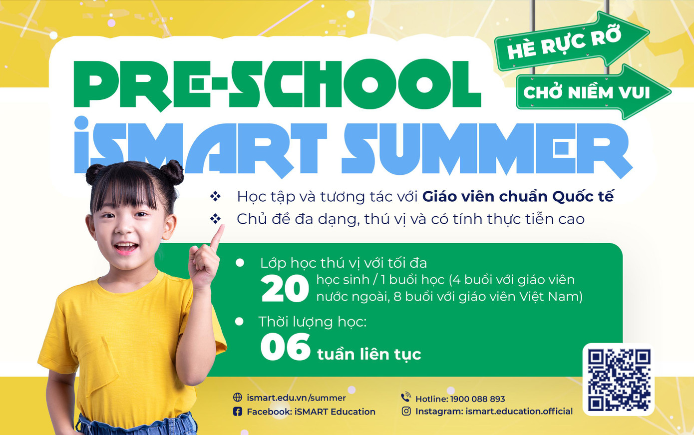 Đối với học sinh chuẩn bị vào lớp 1 (từ 5-6 tuổi), iSMART tổ chức khóa Pre-school iSMART Summer. Các em sẽ được học tiếng Anh tích hợp nội dung Toán, Khoa học và ngôn ngữ theo mô hình Câu lạc bộ hè 2022. Từ đó tạo nền tảng kiến thức, kỹ năng và nề nếp học tập trước thềm năm học mới. Với thời lượng 45 phút/tiết, các em sẽ tham gia 12 buổi học cố định theo lịch với 4 buổi học cùng giáo viên Việt Nam và 8 buổi học với giáo viên nước ngoài. Học phí một khóa là 1.500.000 VND/học sinh.