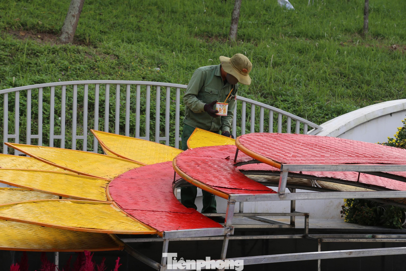 | Công nhân Công ty cổ phần Công viên cây xanh đang tất bật hoàn thiện những công đoạn cuối cùng trên con đường hoa. |