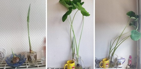 Chị Lan, ở Hà Nội, trồng khoai môn trong chậu nước. Cũng giống như khoai lang, khoai môn ngâm nước lớn rất nhanh, thân cây thẳng tắp.