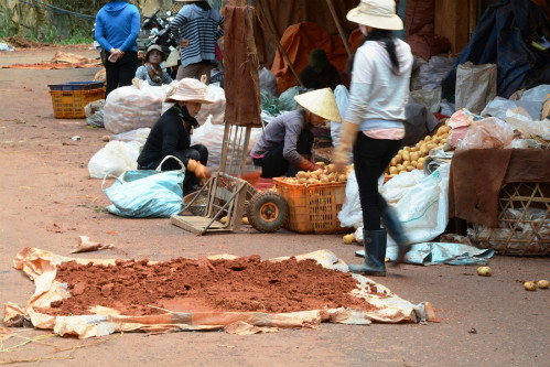 Hoạt động “mặc áo’’ cho khoai tây Trung Quốc tại chợ Đà Lạt diễn ra rất nhộn nhịp, những tiểu thương buôn bán lớn đầu tư hẳn máy rửa khoai có công xuất hàng tấn mỗi ngày, còn các hộ làm thủ công một ngày cũng làm được từ 300-500kg, tùy mối hàng ở TP HCM và các tỉnh đặt. Một tiểu thương cho biết, nhờ chiêu nhuộm này, một tấn khoai tây chủ vựa kiếm được 7-10 triệu đồng, trong khi vào thời điểm chính vụ từ tháng 1 đến tháng 4 hàng năm, thu mua khoai tây kiếm chênh lệnh 1.000 đồng mỗi kg cũng khó.
