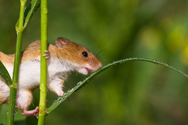 Một con chuột đồng đang uống sương trên ngọn cỏ