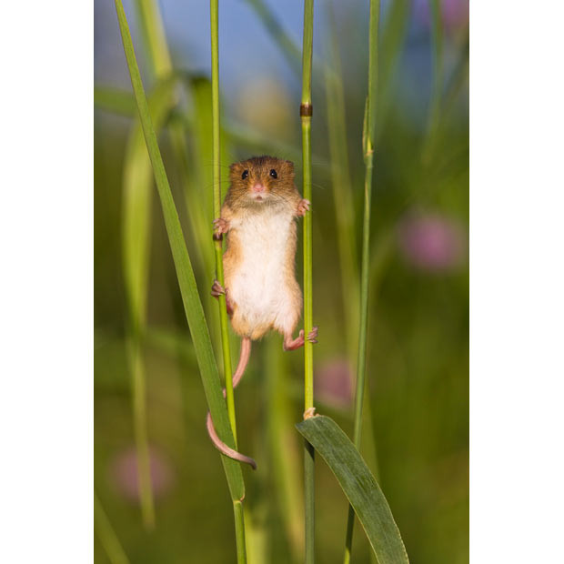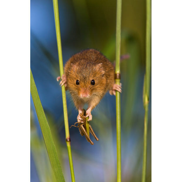 Một con chuột đồng, cân bằng giữa hai thân cây cỏ và bắt một con châu chấu bằng hai bàn chân trước.