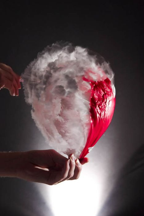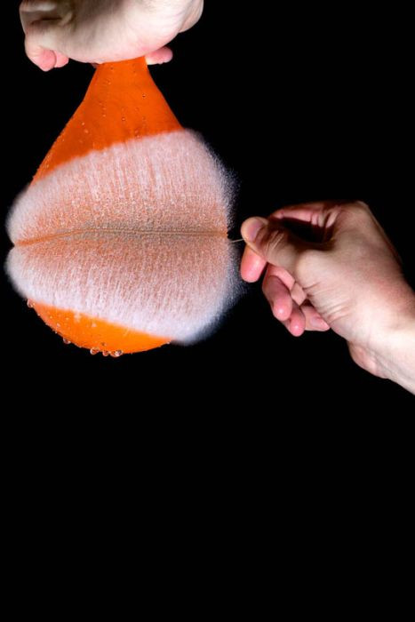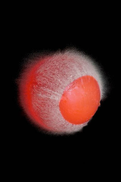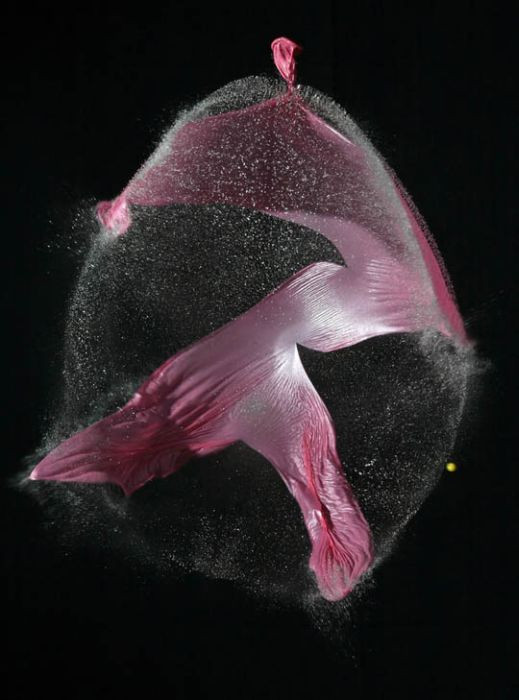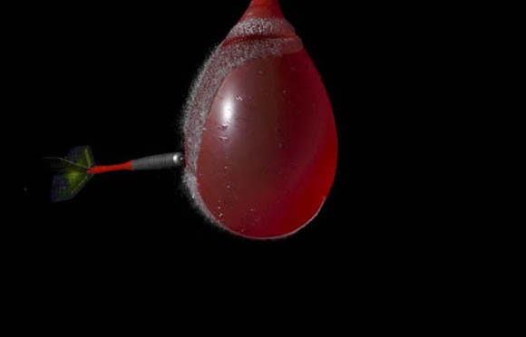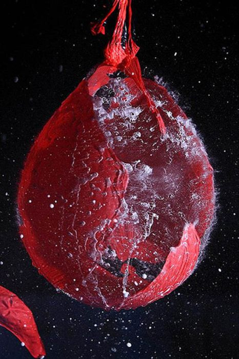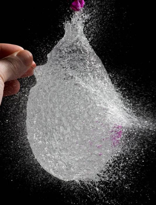 Bình thường chúng ta chỉ có thể nghe tiếng nổ "bốp" sau khi chọc thủng, theo sau đó là nước trong quả bóng chảy ào xuống đất. Nhưng trong một khoảng khắc rất ngắn, chỉ một phần rất nhỏ của giây, lớp bề mặt cao su thu vào và đã "tạo hình" tròn rất đẹp cho khối nước giống hình trái bóng.