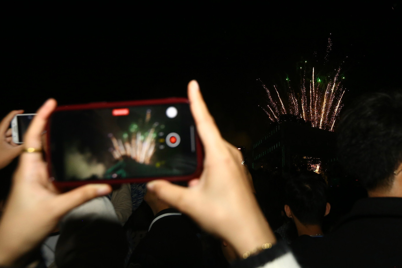 | Người dân đồng loạt ghi lại khoảnh khắc bước sang năm mới bằng những chiếc điện thoại cá nhân. |