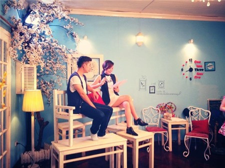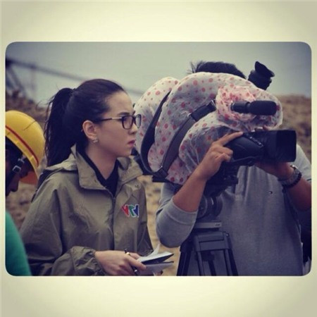 MC Phí Linh ngồi cả trên... bàn để quay hình