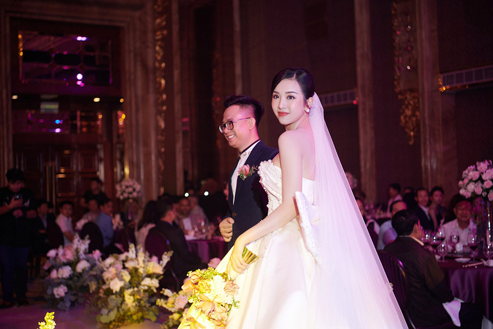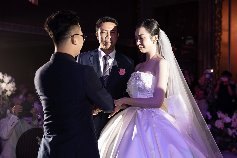Á hậu Thuý An xuất hiện trong bộ cánh lộng lẫy và được bố mình dắt tay lên lễ đường trao cho con rể. Khoảnh khắc ngập tràn hạnh phúc ấy được chứng kiến bởi quan viên hai họ và đông đảo bạn bè của đôi vợ chồng khiến nhiều người xúc động.