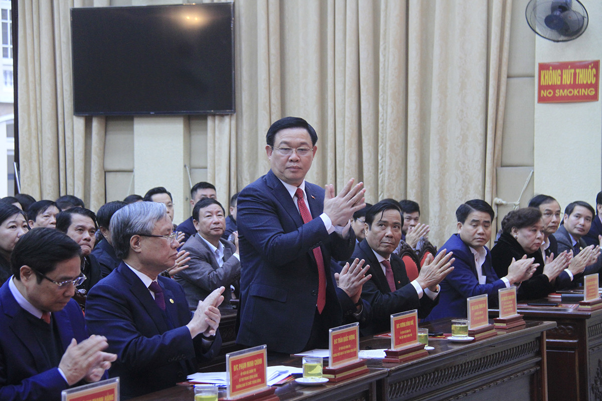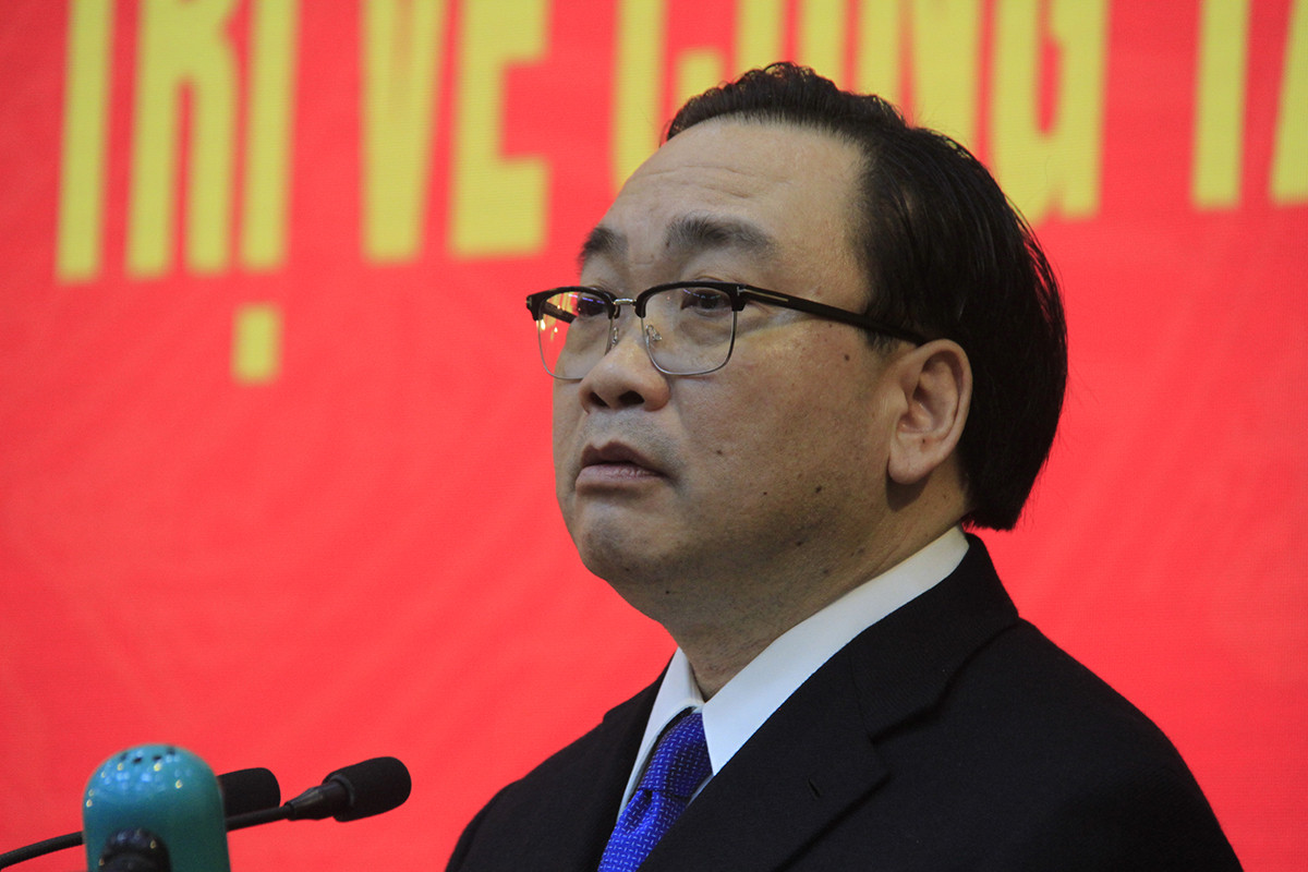 Ông Hoàng Trung Hải cảm ơn tập thể Ban Chấp hành, Ban Thường vụ và nhân dân Thủ đô đã chung sức, giúp đỡ tập thể và cá nhân ông. Ông cũng thừa nhận còn nhiều thiếu sót, chưa hoàn thành. Ông mong muốn các cán bộ và nhân dân Thủ đô thứ lỗi. Ảnh: Trường Phong
