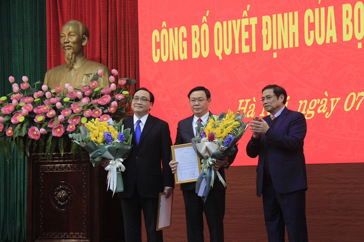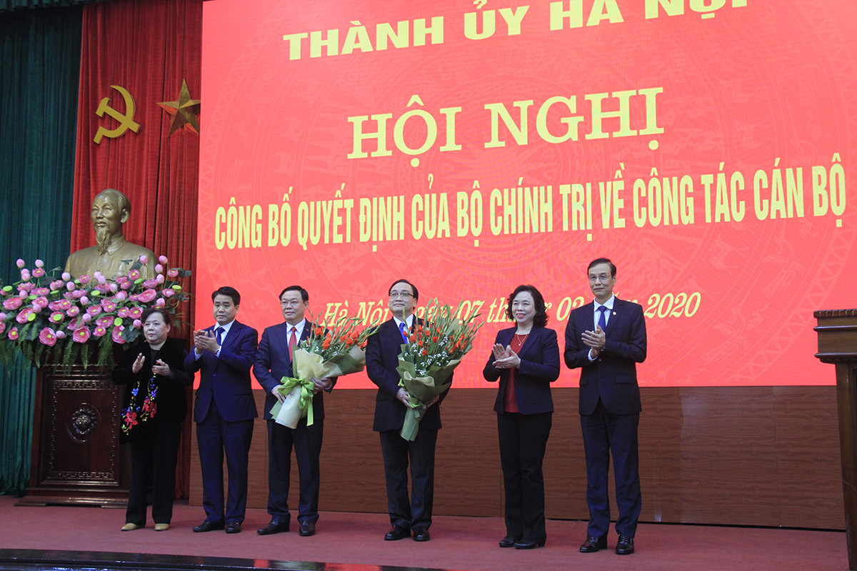 Lãnh đạo thành phố Hà Nội tặng hoa chúc mừng ông Vương Đình Huệ và ông Hoàng Trung Hải. Ảnh: Trường Phong