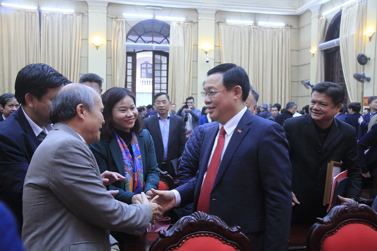 Tân Bí thư Thành ủy Hà Nội Vương Đình Huệ bắt tay, trò chuyện với cán bộ chủ chốt thành phố Hà Nội. Ảnh: Trường Phong