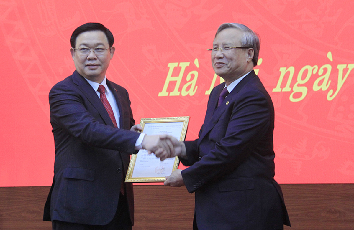 Thường trực Ban Bí thư Trần Quốc Vượng trao quyết định cho ông Hoàng Trung Hải làm Phó trưởng Bộ phận chuyên trách Tiểu ban Văn kiện Đại hội XIII của Đảng. Ảnh: Trường Phong