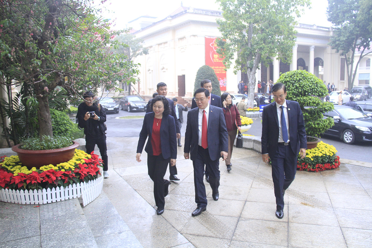 Ông Vương Đình Huệ cùng Phó Bí thư Thường trực Thành ủy Hà Nội Ngô Thị Thanh Hằng và Phó Bí thư Thành ủy Hà Nội Đào Đức Toàn vào phòng họp của Thành ủy Hà Nội. Ảnh: Trường Phong