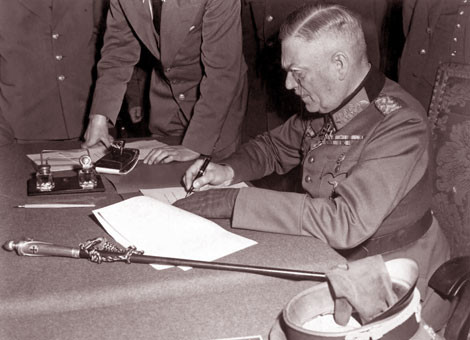 …Trên chiếc bàn trung tâm, văn kiện chính thức đã được các đại diện quân Đồng minh gồm Nguyên soái Liên Xô Georgy Zhukov, Thống chế Không quân Anh William Arthur Tedder, Đại tướng Không quân Mỹ Carl Andrew Spaatz và sau cùng là Đại tướng Jean de Lattre de Tassigny, Tổng tư lệnh quân đội Pháp ký vào. Khi những người chiến thắng đang lần lượt ký, vẻ mặt Thống chế Keitel trông thật đáng sợ. Ông ta chờ đợi khoảnh khắc phải chấp bút của kẻ bại trận. Keitel ngồi bất động, còn viên sĩ quan tùy tùng cao lớn ngồi phía sau thì khóc rống lên.