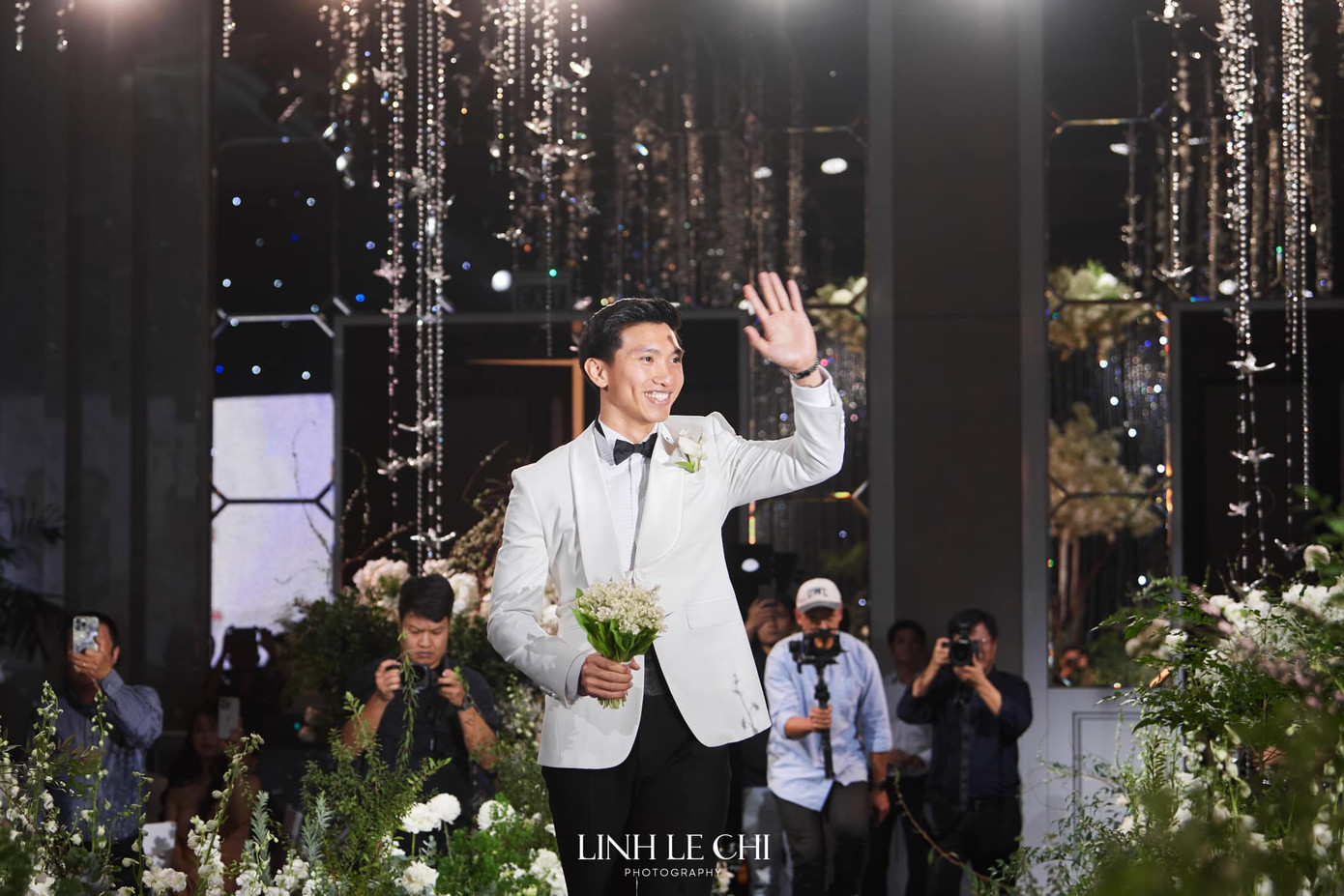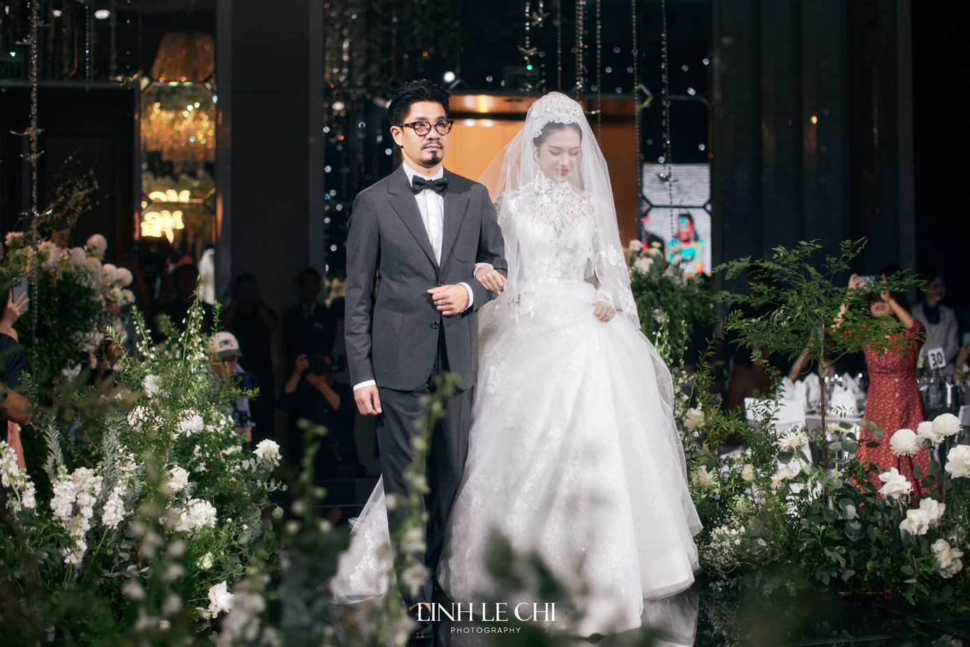 Khách mời trong đám cưới gồm đông đảo người thân, bạn bè, đồng nghiệp thân thiết của cô dâu và chú rể. Dresscode tới dự tiệc cưới gồm 3 màu chủ đạo là hồng phấn, xám và be. Không gian đám cưới được thiết kế sang trọng, hiện đại, ngập đầy hoa tươi màu trắng, đặc biệt là được bảo vệ nghiêm ngặt.