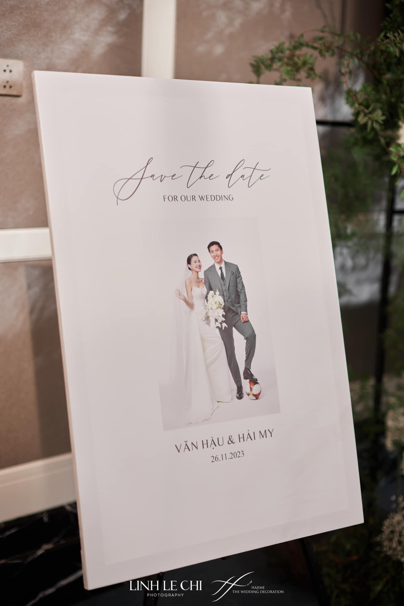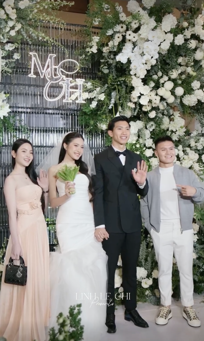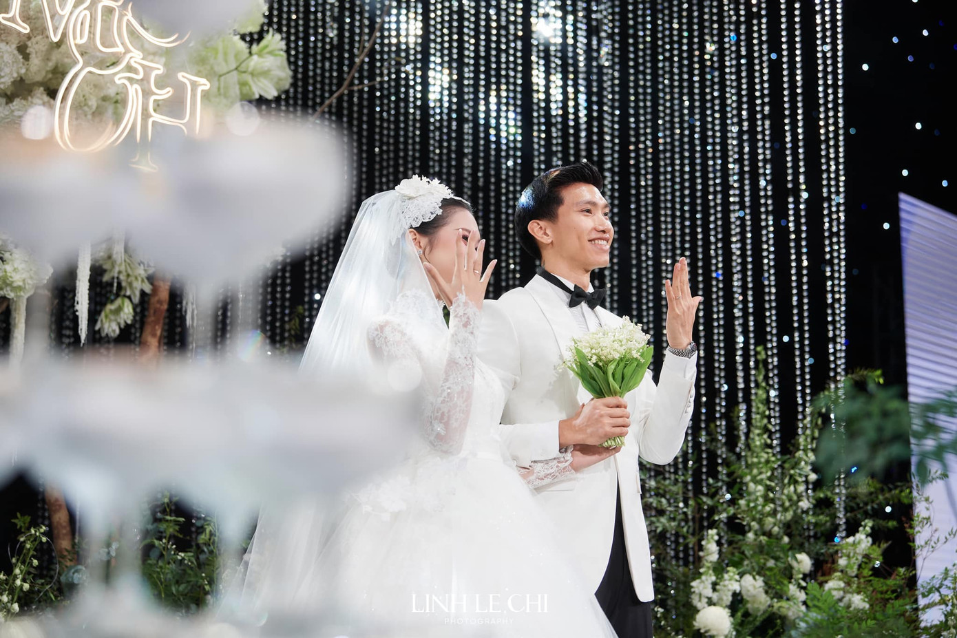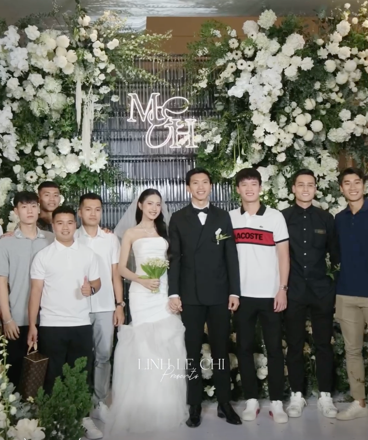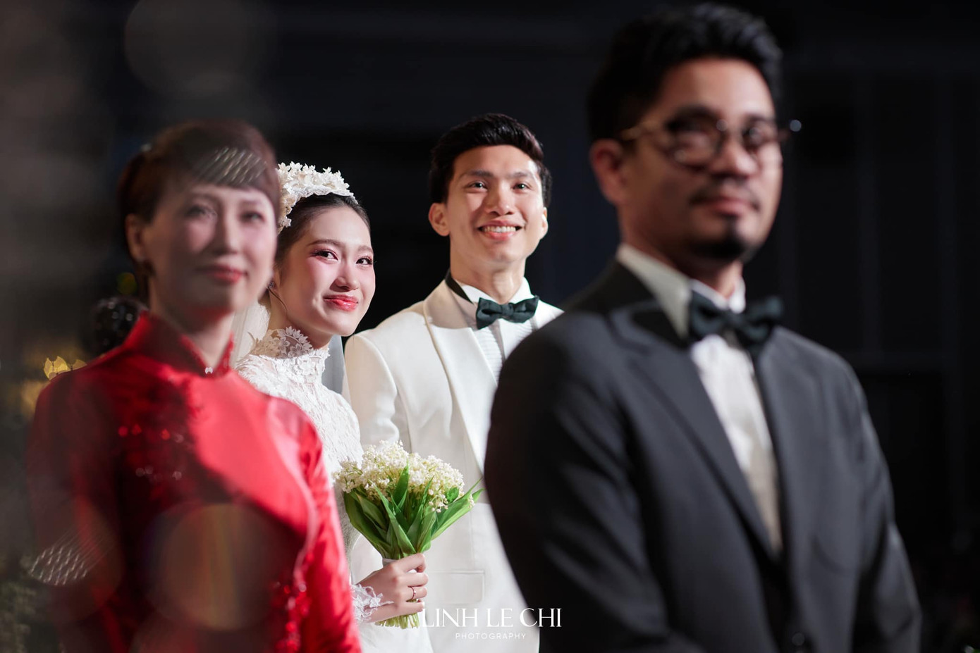 Nếu trước khi làm lễ, Doãn Hải My khoác lên mình bộ váy màu trắng cúp ngực, Đoàn Văn Hậu diện vest màu đen lịch lãm thì khi bước vào làm lễ, cô dâu mặc váy cưới tay dài, cao cổ, còn chú rể thay vest màu trắng.