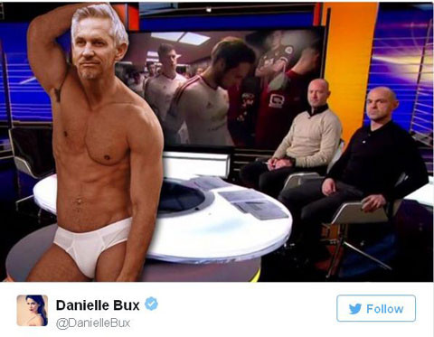 Cựu tiền đạo Gary Lineker thì không “xuống tiền” nhưng khiến dư luận xứ sương mù xôn xao suốt mùa giải này với tuyên bố nếu Leicester vô địch, ông sẽ mặc mỗi quần lót khi lên hình bình luận chương trình đầu tiên ở mùa giải sau. Lineker đã thua. Trong khi các fan đang tò mò chờ xem màn cởi đồ của Lineker ở đầu mùa tới, cô vợ cũ Danielle Bux của ông nhanh tay chế luôn ảnh nóng về ông.